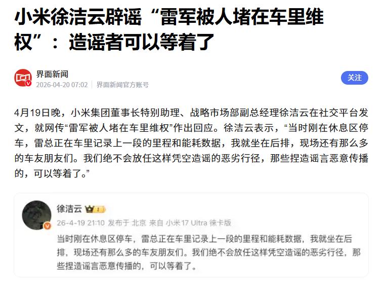 据媒体报道,4月19日,小米高管徐洁云针对“雷军被人堵在车里维权”这一谣言表示:“当时刚在休息区停车,雷总正在车里记录上一段的里程和能耗数据,我就坐在后排,现场还有那么多的车友朋友们。我们绝不会放任这样凭空造谣的恶劣行径,那些捏造谣言恶意传播的,可以等着了。”