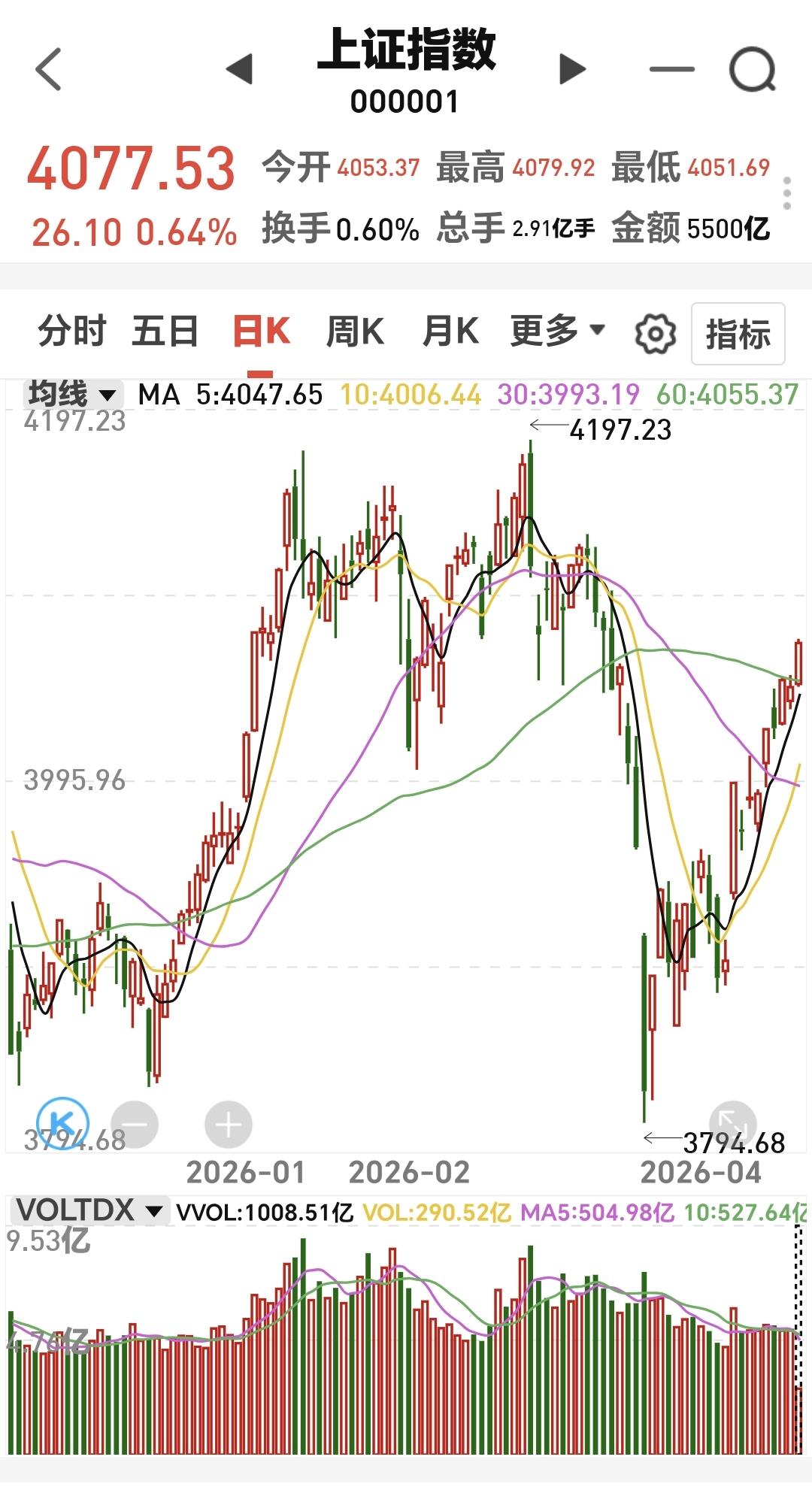 黄色线还是在蓝色线的下方,两条线之间的敞口还是不小,五天线位置在4045点附近,盘中的震荡调整,只要不跌破4045点,就不要担心。
