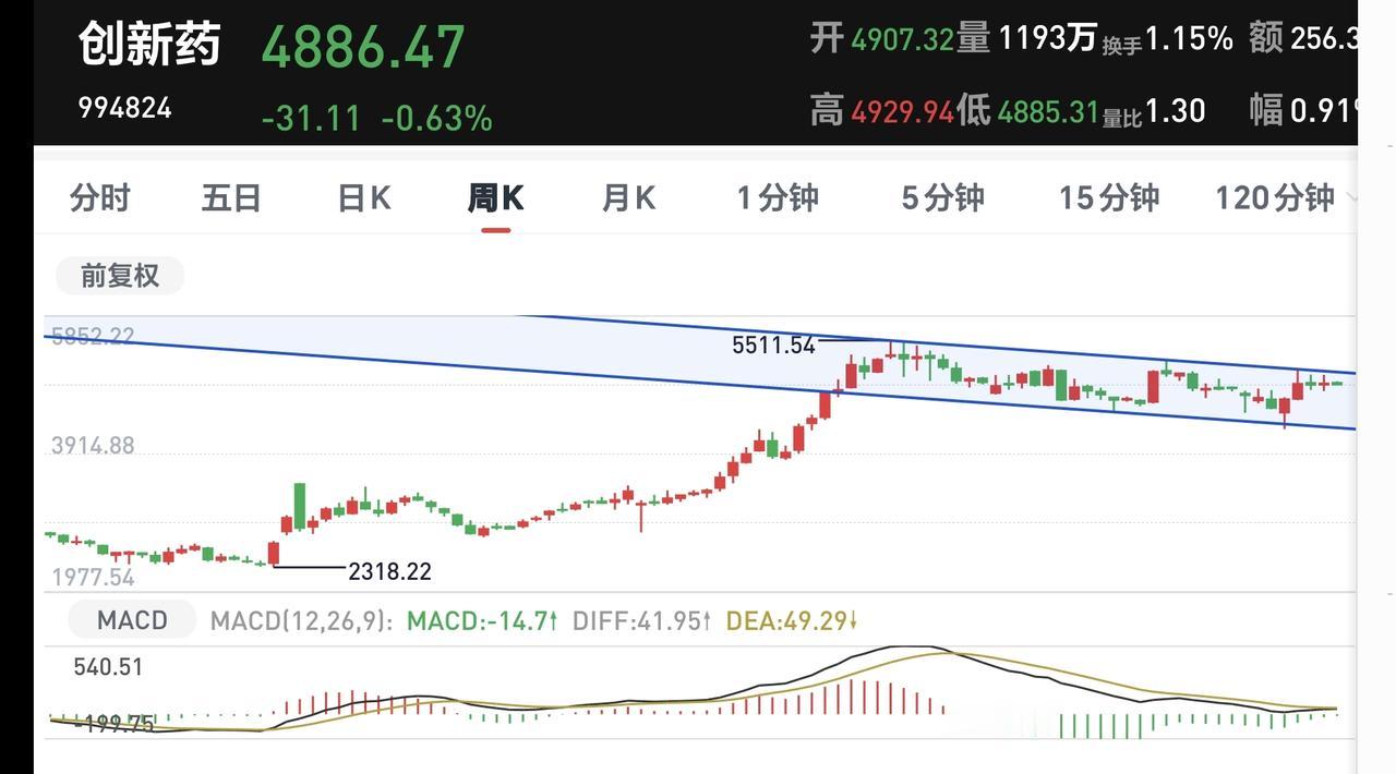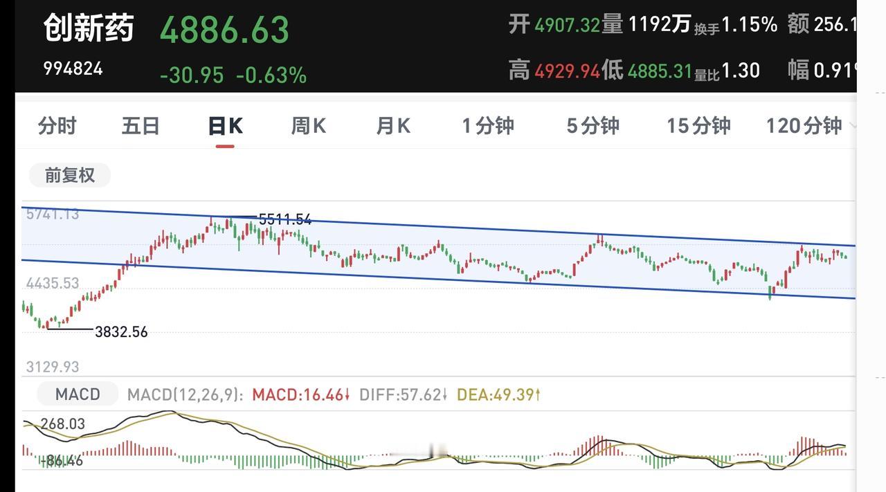 创新药板块日线级别和周线级别都处于下跌通道中,这两个下跌通道的时间段是相同的,前段时间都是上涨到了下跌通道上轨线附近,最近几个交易日是震荡回落,只要没有能够上涨突破这个下跌通道的上轨线,都不能认为这个板块已经反转,想进场的人需要耐心等待上涨突破这个下跌通道的上轨线,再考虑要不要进场。