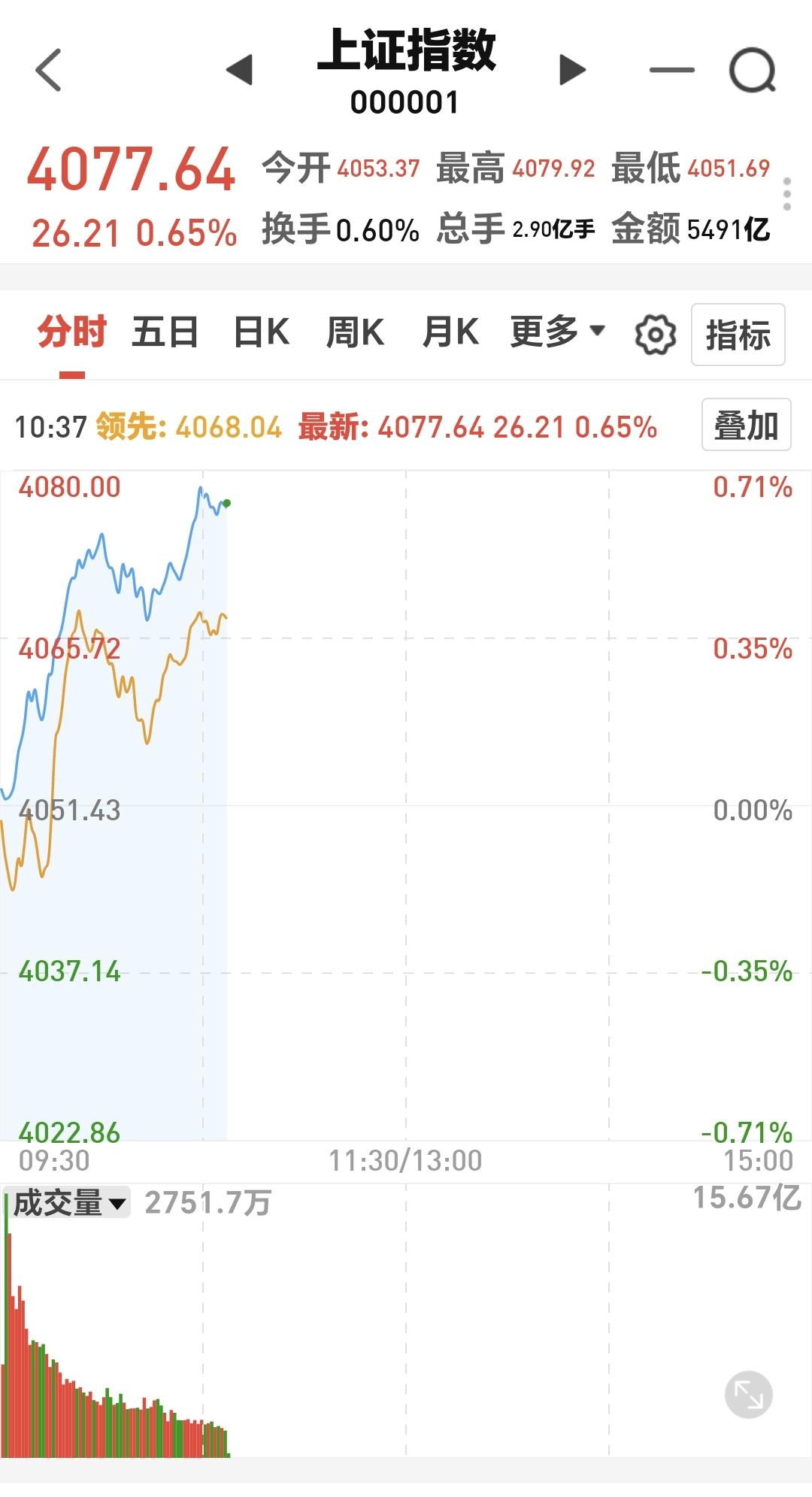 三大指数全线上涨,创业板指上涨了0.44%,盘中点位3694点,上证指数上涨了0.66%,盘中点位4078点。