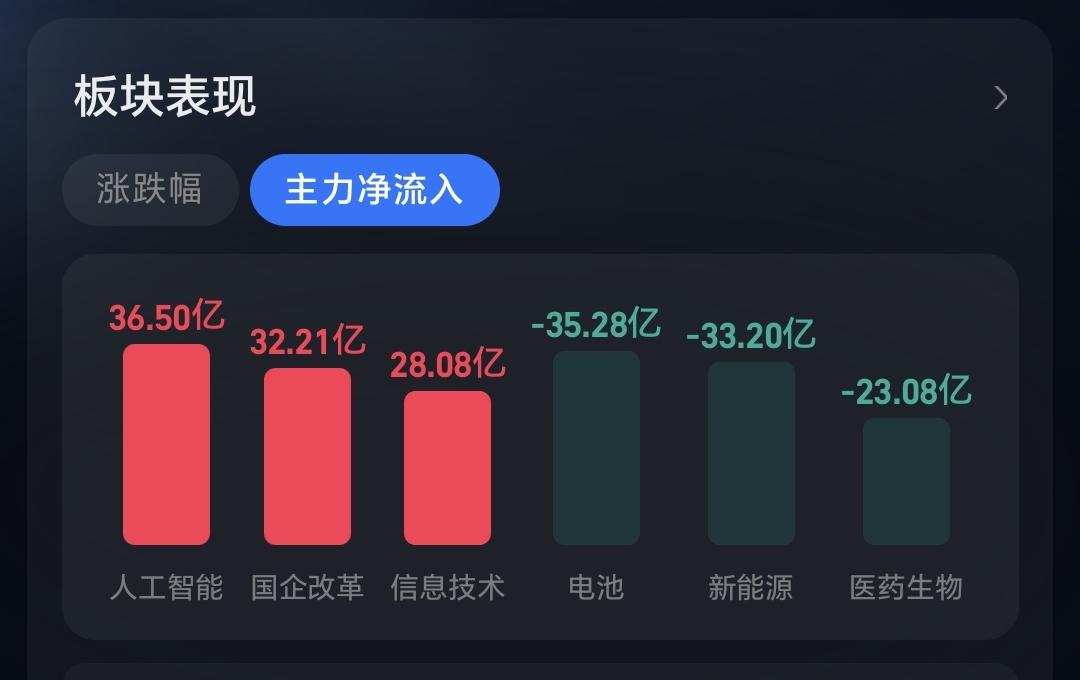 主力资金净流入最多的三个板块是:人工智能板块,国企板块,信息技术板块,主力资金净流出最多的三个板块是:电池板块,新能源板块,医药生物板块。