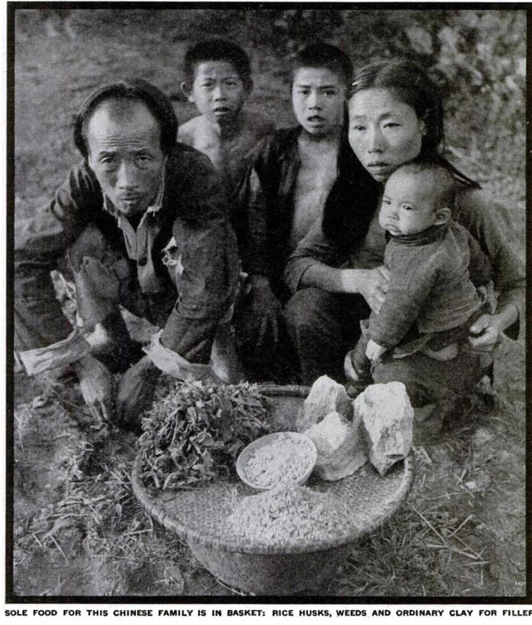 图片底部英文原文直译:这个中国家庭唯一的食粮,仅有筐中物,稻壳、野草,以及用来填肚子充饥的普通白黏土。