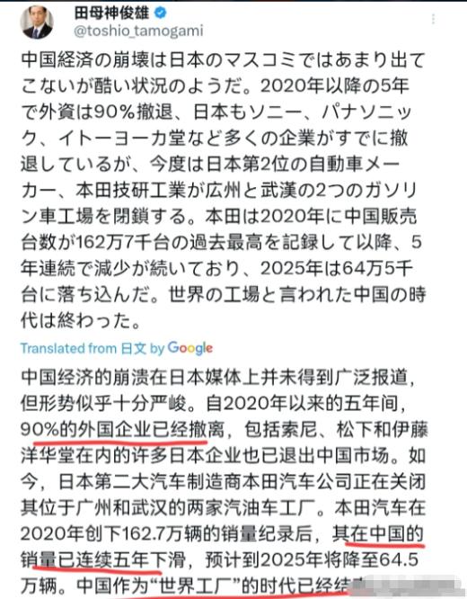 日本前航空幕僚长田母神俊雄声称,中国时代已然终结!4月19日,田母神俊雄表示,虽然日本媒体很少报道“中国经济崩溃”,但情况似乎十分严峻。2020年之后的五年间外资“已撤离”90%,日本方面索尼、松下、伊藤洋华堂等众多企业也已“撤出”。此番日本第二大车企本田技研工业,将关闭位于广州和武汉的两家燃油车工厂。