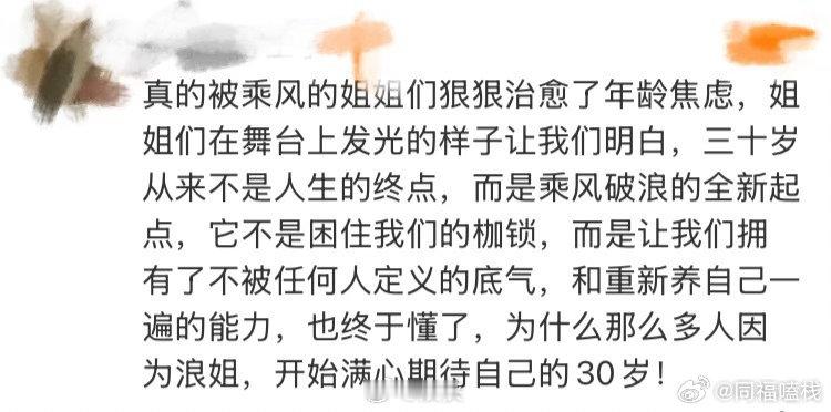 30岁后不催婚而是上浪姐 太认同了!30岁以后,世俗的问候从"结婚了吗"变成"要不要上浪姐",这就是《乘风2026》最珍贵的意义。它把年龄焦虑变成了成长勋章,让女性看见:岁月不是枷锁,而是底气。不必被婚姻定义,不必被年龄框住,每一岁都有新的光芒与可能。愿所有姐姐,在任何年纪都敢乘风破浪,永远为自己热烈发光✨!乘风2026