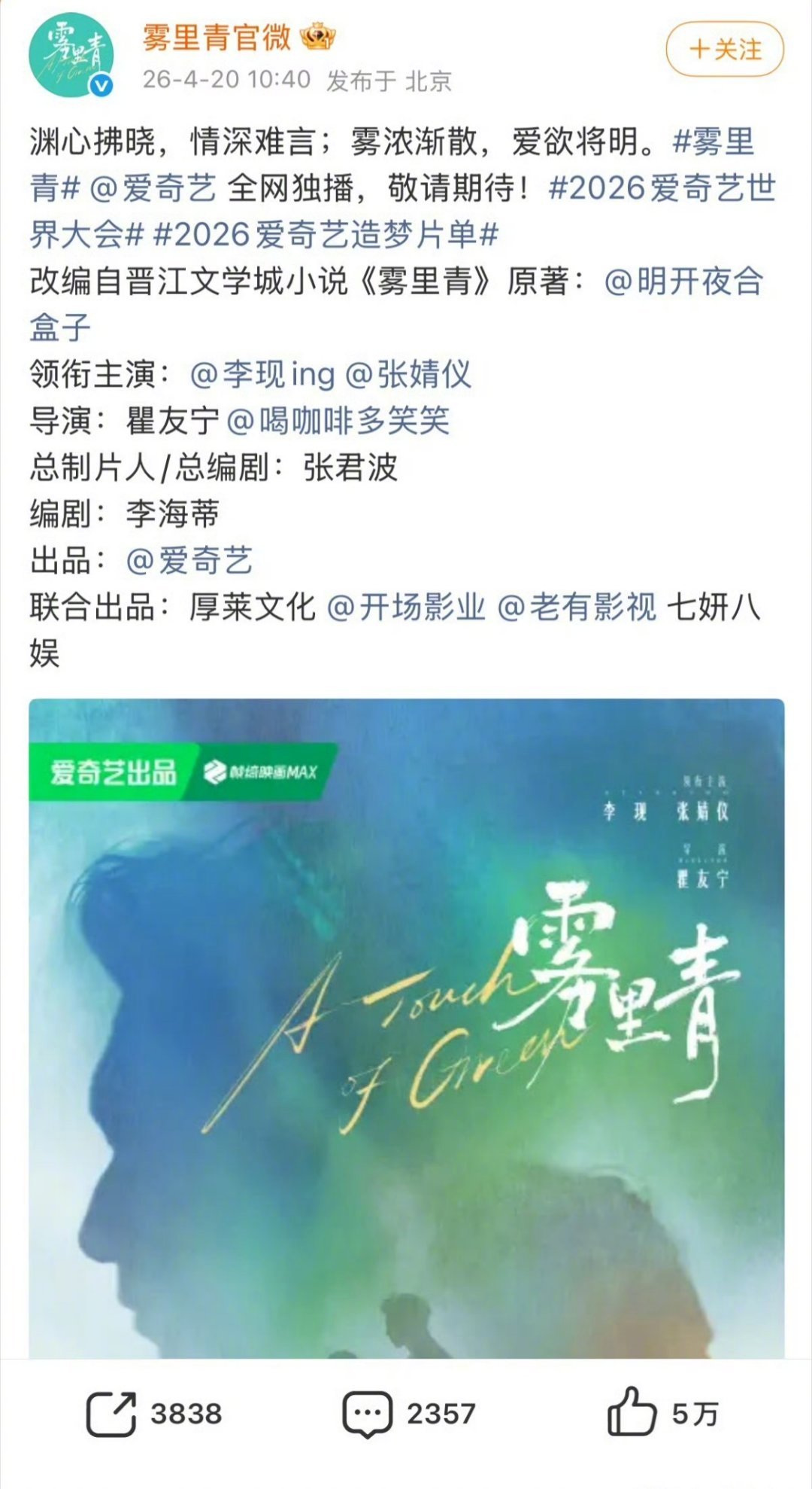 雾里青终于官宣啦!李现 × 张婧仪这组合也太让人期待了!!张婧仪李现
