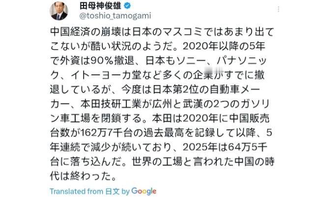 4月19日,田母神俊雄表示,虽然日本媒体很少报道“中国经济崩溃”,但情况似乎十分严峻。2020年之后的五年间外资“已撤离”90%,日本方面索尼、松下、伊藤洋华堂等众多企业也已“撤出”。此番日本第二大车企本田技研工业,将关闭位于广州和武汉的两家燃油车工厂。
