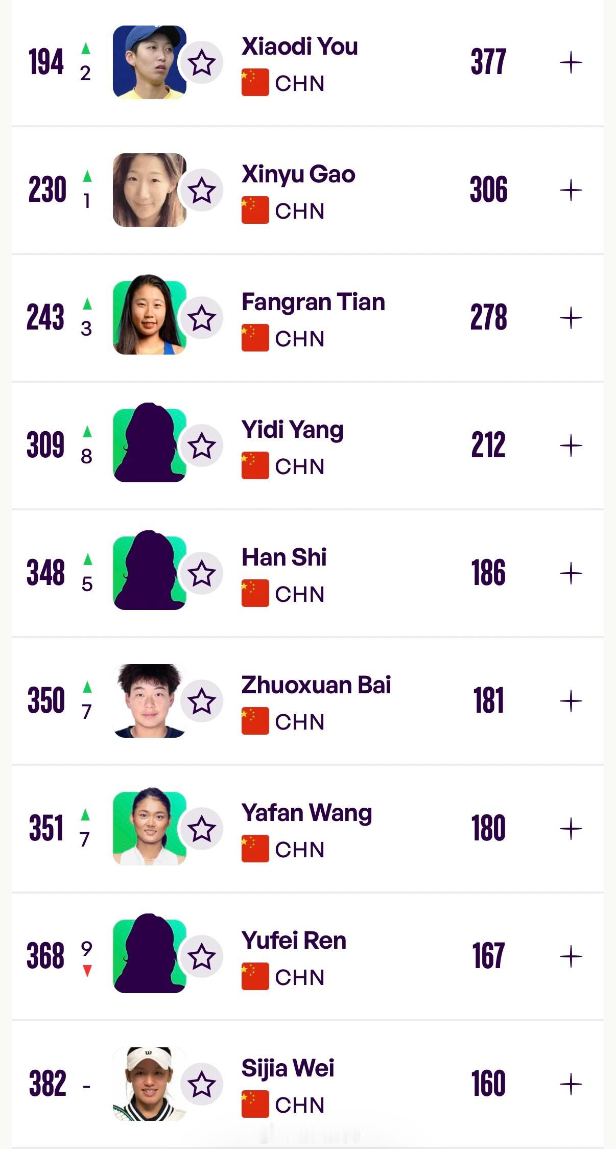 中国球员WTA单打排名更新(Top400)31 王欣瑜🇨🇳(+1)36 郑钦文🇨🇳(+1)65 张帅🇨🇳(+1)111 袁悦🇨🇳(+3)135 朱琳🇨🇳(+1)170 王曦雨🇨🇳(+1)173 郭涵煜🇨🇳(+1)175 马烨欣🇨🇳(-8)194 尤晓迪🇨🇳(+2)230 高馨妤🇨🇳(+1)243 田方然🇨🇳(+3)309 杨一迪🇨🇳(+8)348 施晗🇨🇳(+5)350 白卓璇🇨🇳(+7)351 王雅繁🇨🇳(+7)368 任钰菲🇨🇳(-9)382 韦思佳🇨🇳