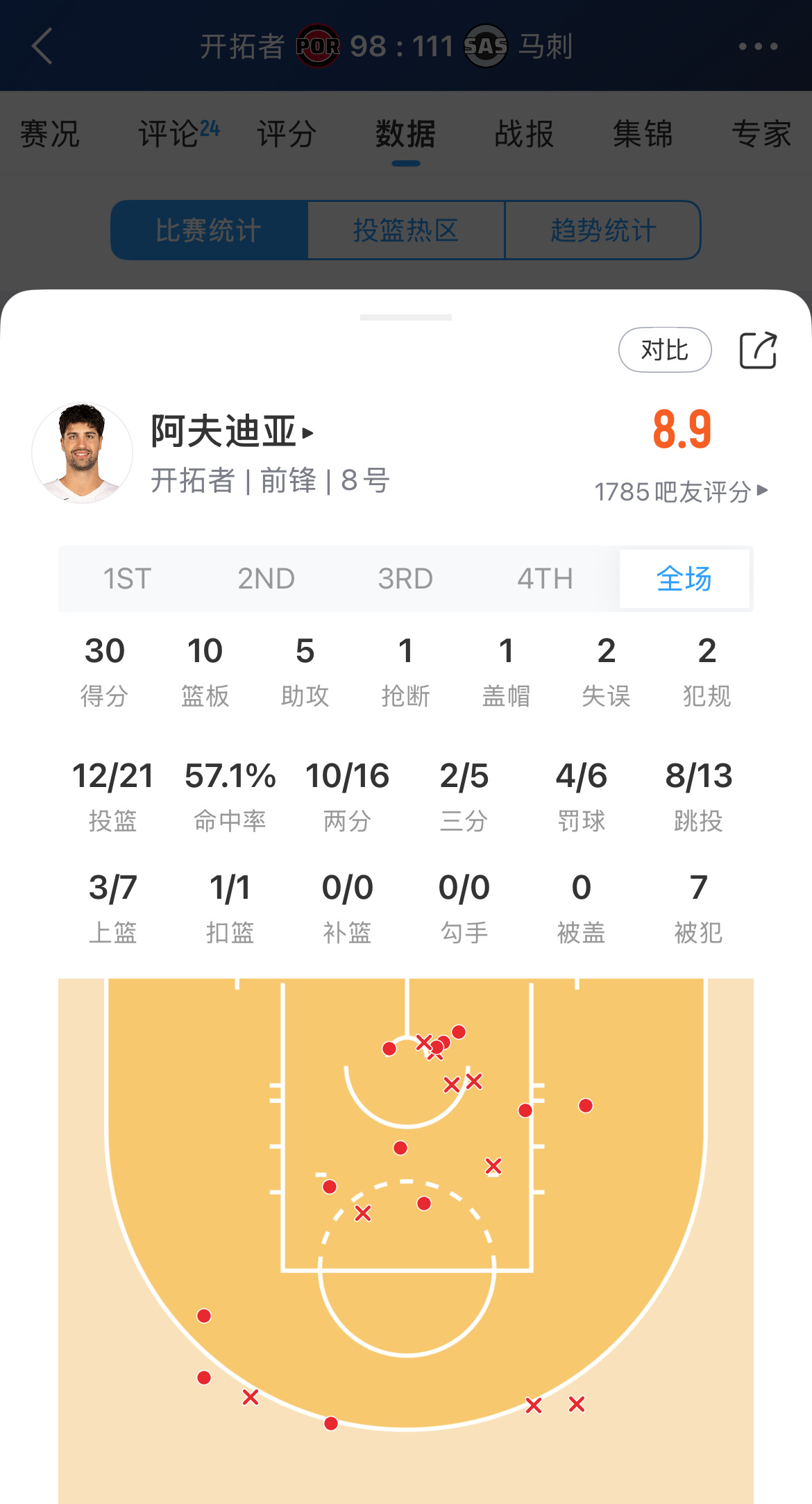 阿夫迪亚首场季后赛:30分10板5助(出场39分钟)