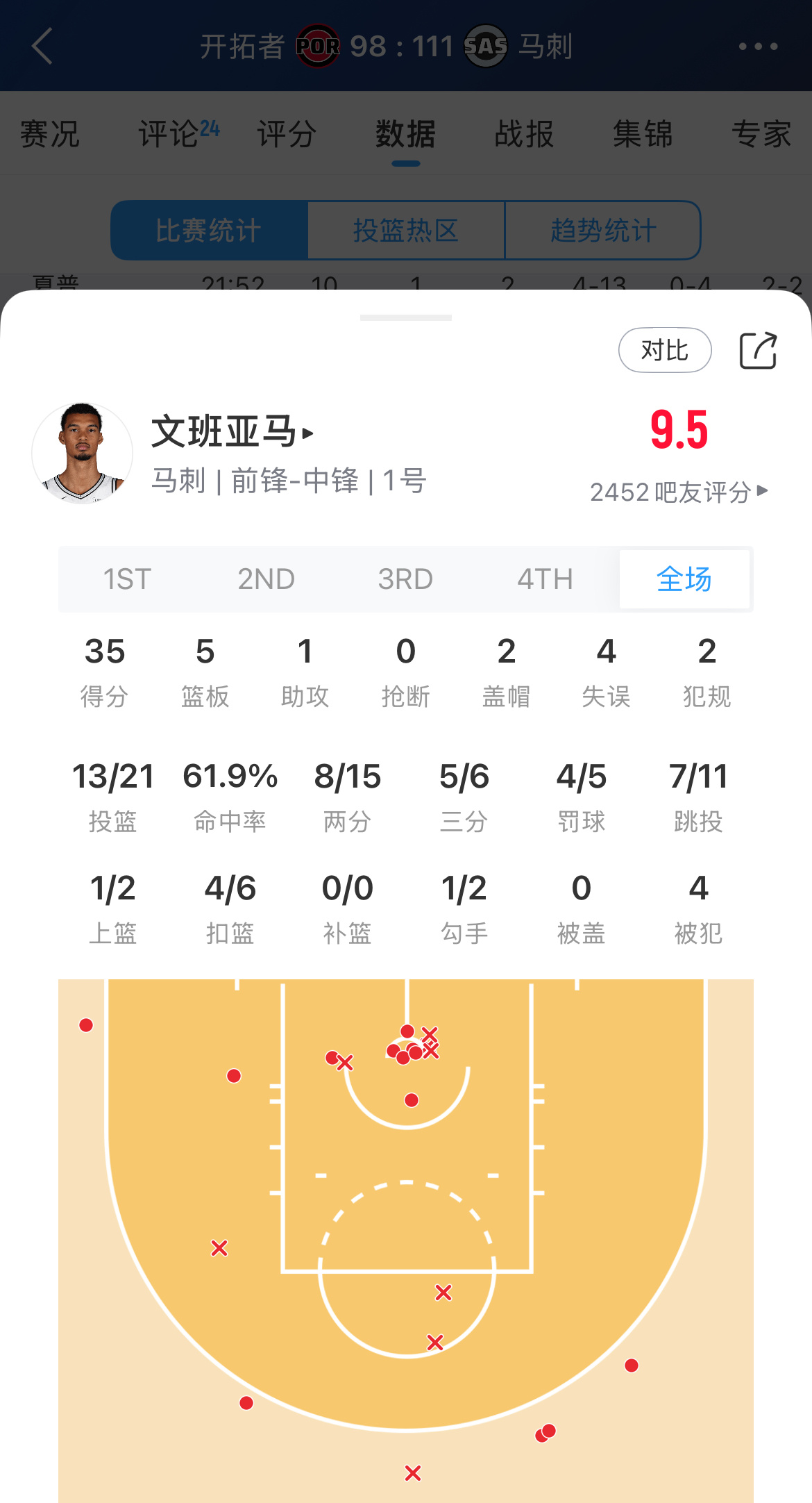 文班亚马季后赛首秀:出场33分钟砍下35分5板2封盖,三分6中5🔥开拓者vs马