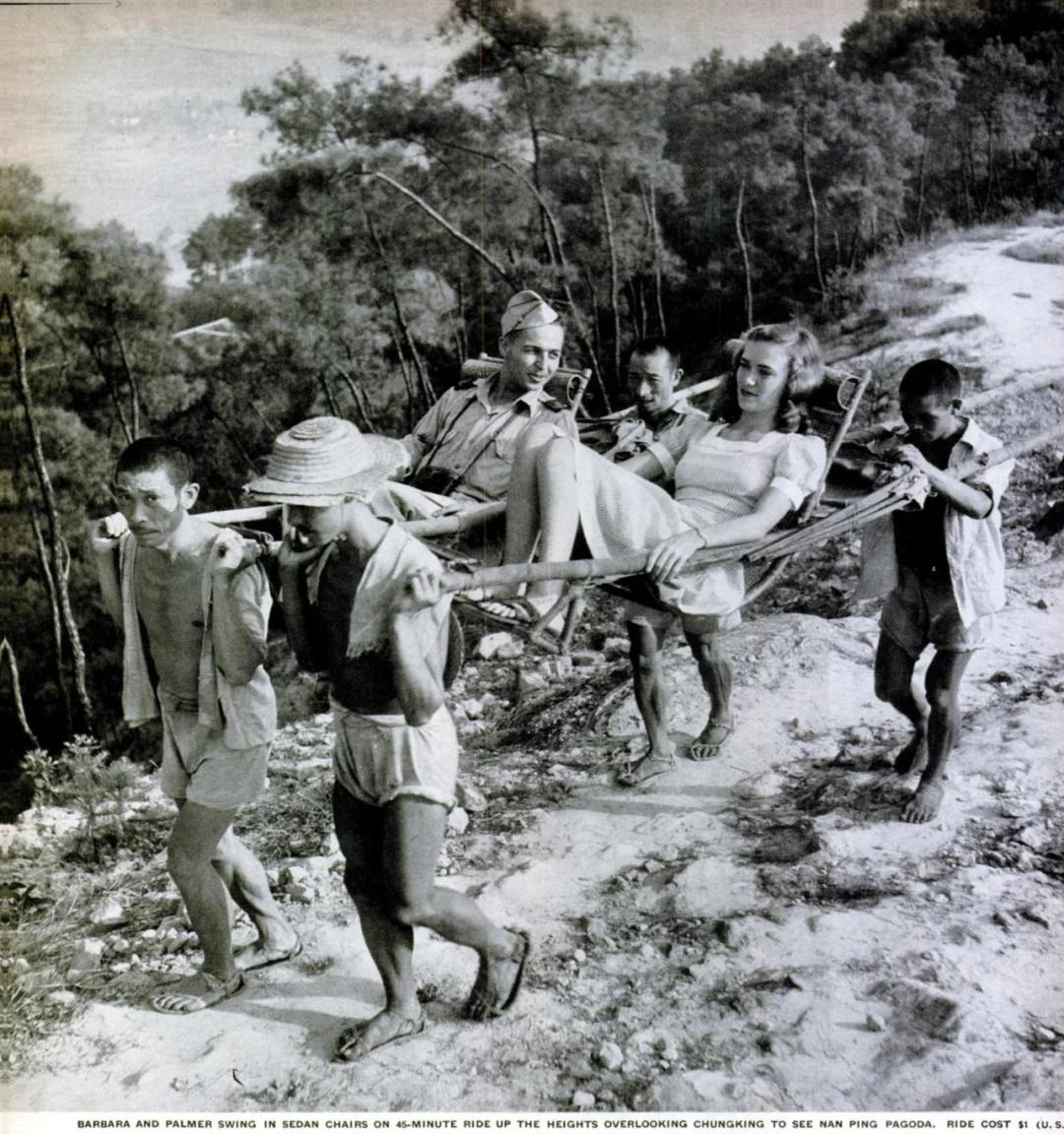 轿中安坐的芭芭拉与帕尔默,一身西式装束,悠然闲坐,只需花费1美元,便可享受45分钟的山间上行路程,登高俯瞰整片山城,饱览重庆南坪坝的壮阔江景。