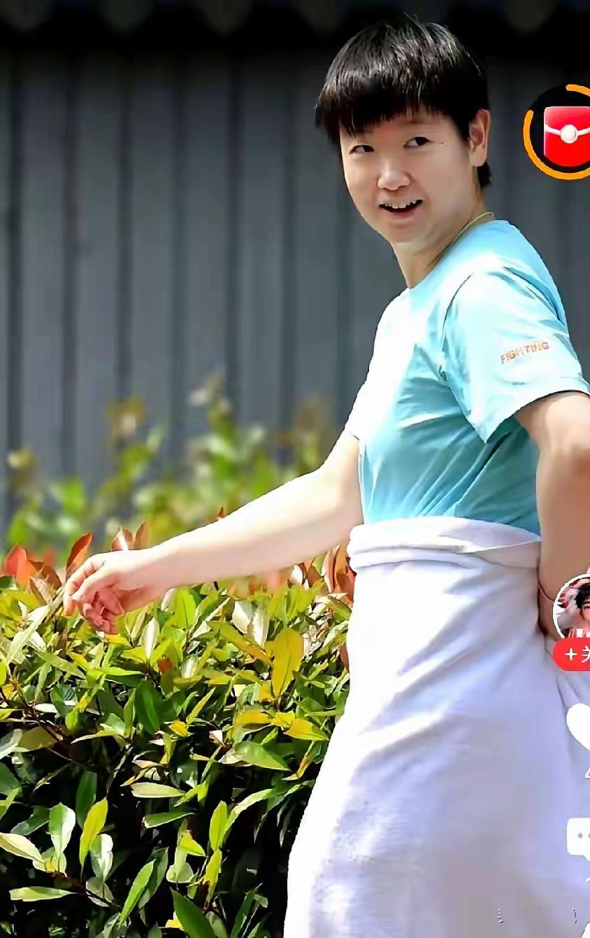 这组照片是孙颖莎在成都封训期间的路透,因为当地气温升高,她直接就地取材,用毛巾改造出了这条“限定款裙子”。