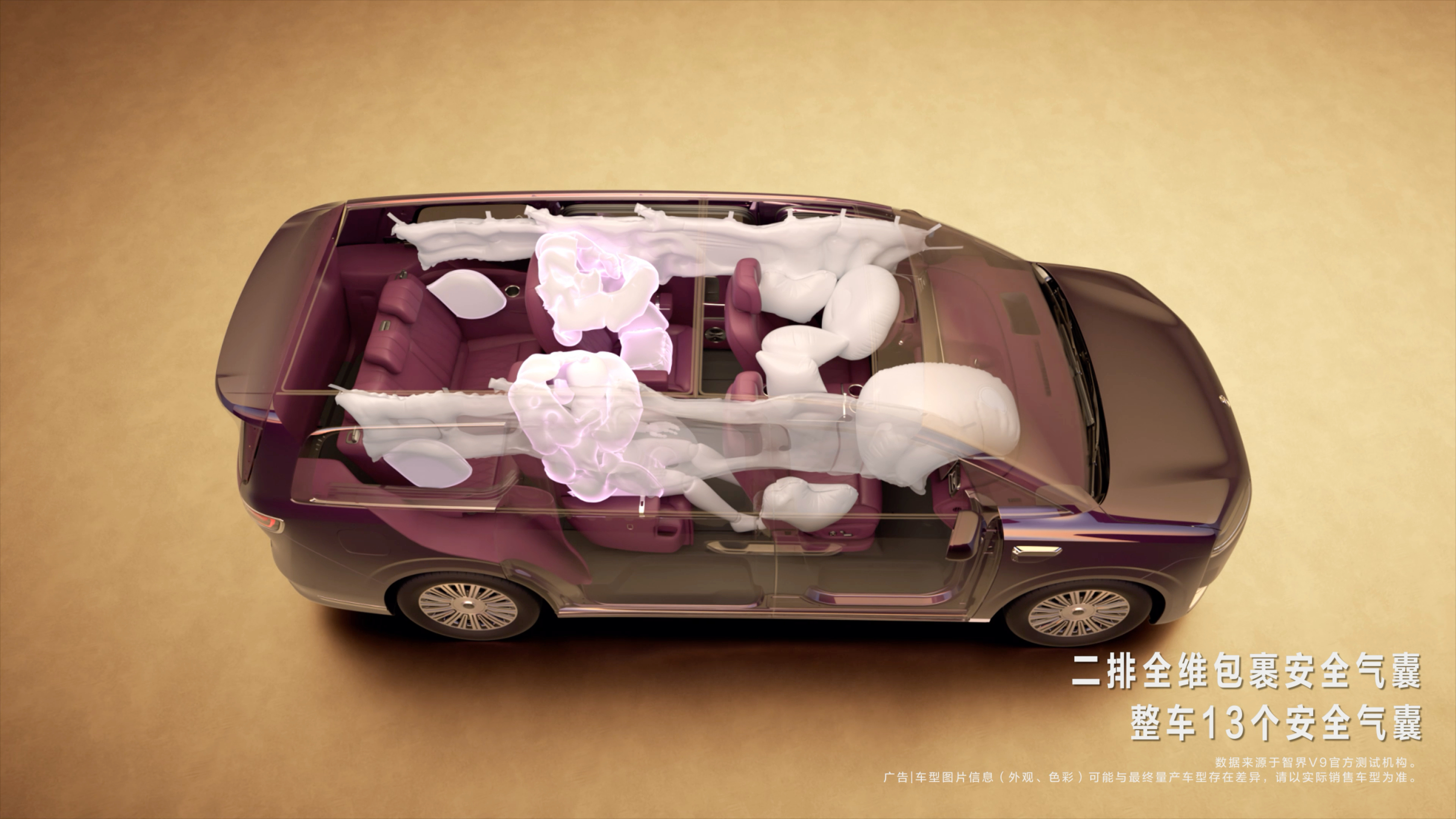 智界V9首发同级最多安全气囊顶配安全拉满!智界V9搭载同级最多安全气囊,全方位细