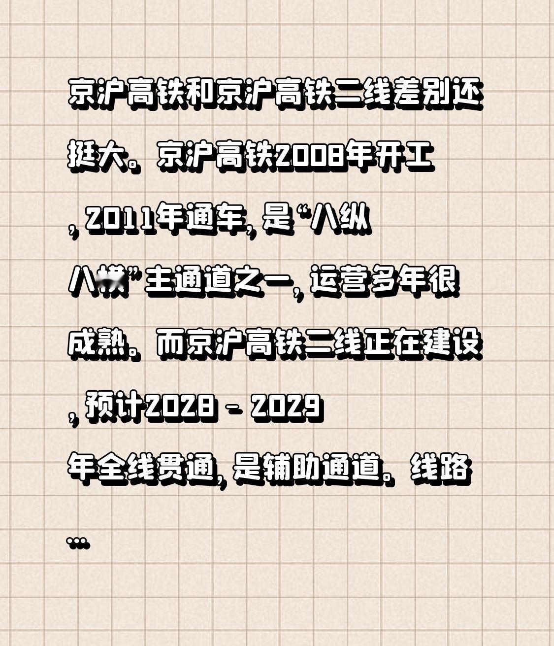 京沪高铁和京沪高铁二线差别还挺大。京沪高铁2008年开工,2011年通车,是“八纵八横”主通道之一,运营多年很成熟。而京沪高铁二线正在建设,预计2028 - 2029年全线贯通,是辅助通道。