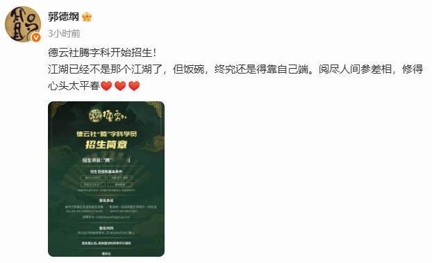 郭德纲叮嘱腾字科,饭碗得靠自己端!德云社郭德纲发文,晒出了腾字科的招生海报。与此同时,郭德纲在线叮嘱腾字科,江湖已经不是那个江湖了,但饭碗,终究还是得靠自己端。郭德纲这句话什么意思?短视频平台已经有了不少的解读。从这些解读可以感受到,郭德纲的动态以及腾字科招生,是备受大家关注的,是非常有热度的。关注的人多,调侃的自然也不缺。有网友认为,岳云鹏是了解师父的。郭德纲发的文案,事后,他自己都不一定能看懂。