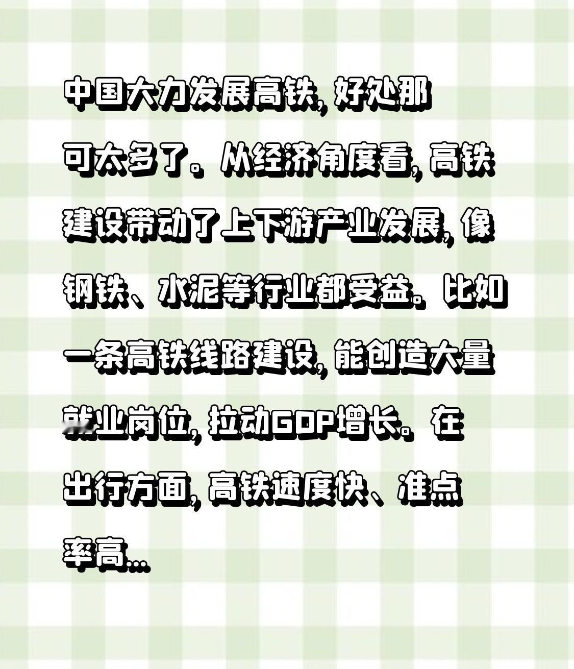 中国大力发展高铁,好处那可太多了。从经济角度看,高铁建设带动了上下游产业发展,像钢铁、水泥等行业都受益。比如一条高铁线路建设,能创造大量就业岗位,拉动GDP增长。