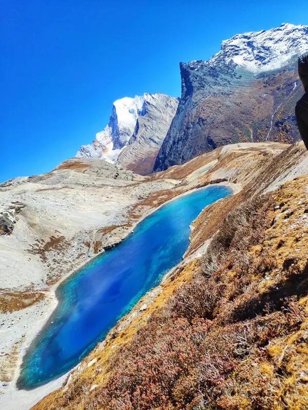 那里的牛奶海美得像一颗蓝色宝石,镶嵌在雪山环绕的山谷中。湖水清澈湛蓝,周边是翠绿的草甸和洁白的雪山,色彩对比强烈,仿佛是一幅天然的油画。
