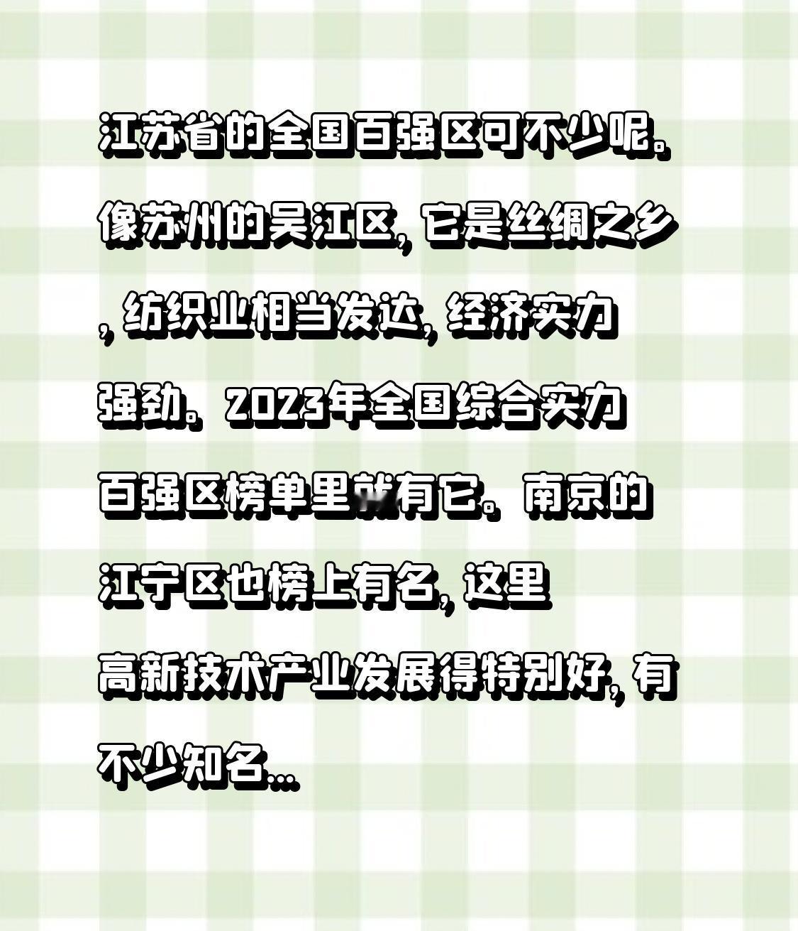 江苏省的全国百强区可不少呢。像苏州的吴江区,它是丝绸之乡,纺织业相当发达,经济实力强劲。2023年全国综合实力百强区榜单里就有它。南京的江宁区也榜上有名,这里高新技术产业发展得特别好,有不少知名企业入驻。另外,无锡的新吴区也很厉害,作为国家级高新区,在集成电路、生物医药等领域成果显著。这些百强区都凭借自身的特色产业和优势,在全国崭露头角,为江苏的经济发展添砖加瓦。