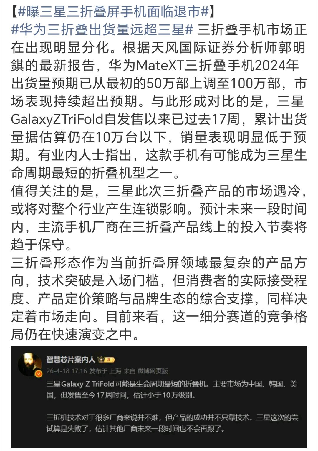 曝三星三折叠屏手机面临退市退就退吧,三星这个,确实做得没有华子好,有点强行上的感