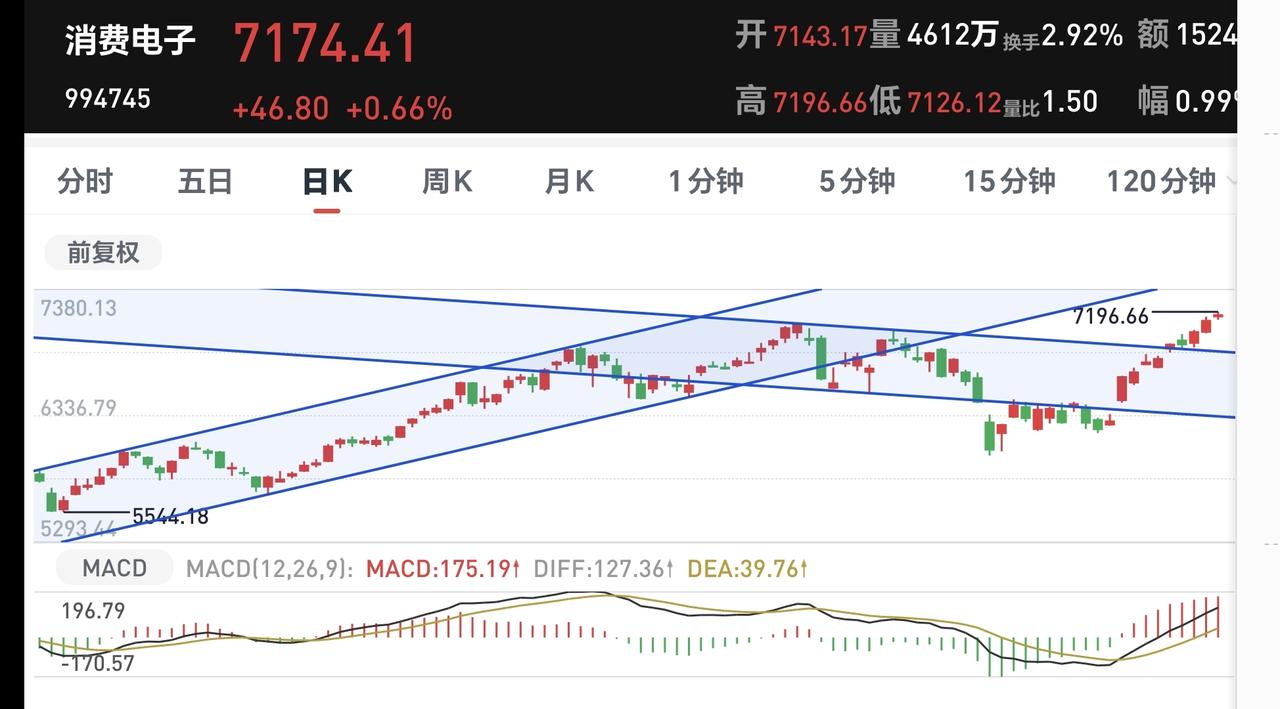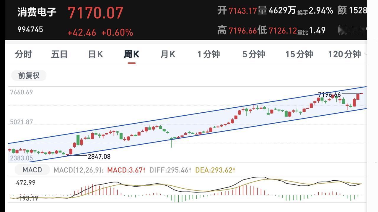 消费电子板块周线级别处于上涨通道中,只要不跌破这个上涨通道的下轨线,这个板块就处于上涨趋势中,只要是处于上涨趋势中,长线持有的人就可以继续持有。