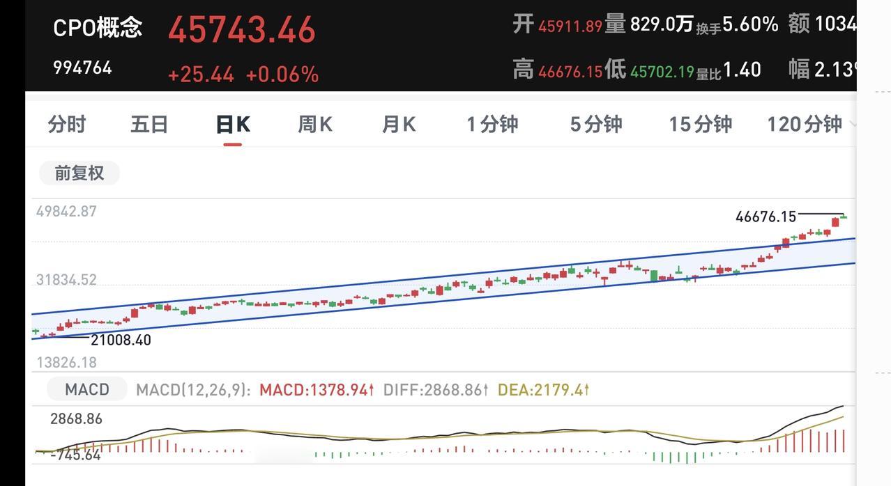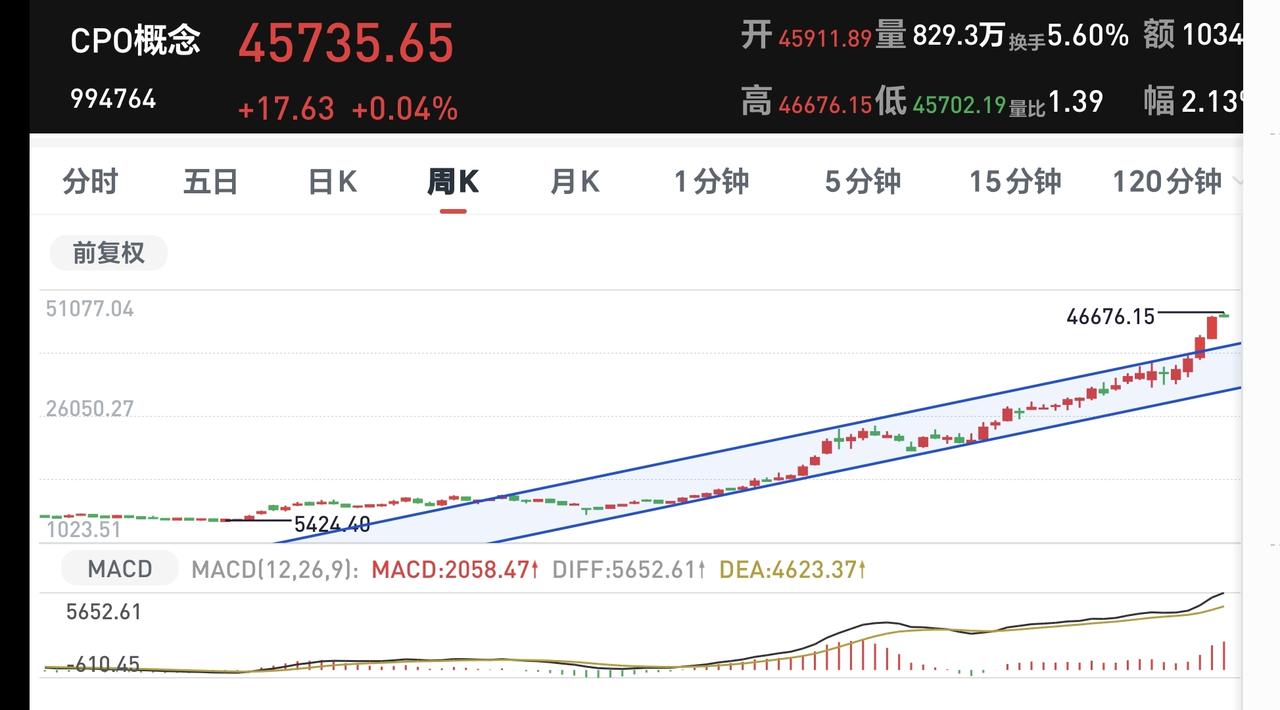 Cpo板块日线级别和周线级别都处于上涨趋势中,他们都上涨突破了上涨通道的上轨线,进入了加速上涨的走势。不管是短线持有的人还是长线持有的人,都可以继续持有,但在进入加速上涨走势以后,不建议在这样的位置追涨进场。