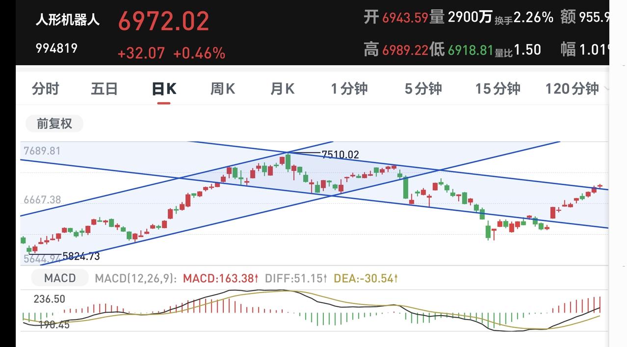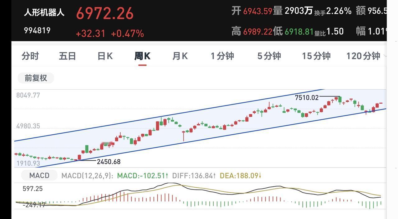 机器人板块周线级别处于上涨通道中,近期的上涨起点就是从上涨通道下轨线附近开始的,上涨通道和下跌通道的下轨线都是可以考虑的进场点,上涨通道的下轨线比下跌通道的下轨线更稳妥一点。