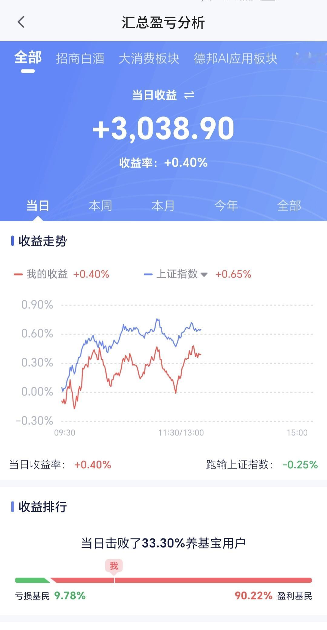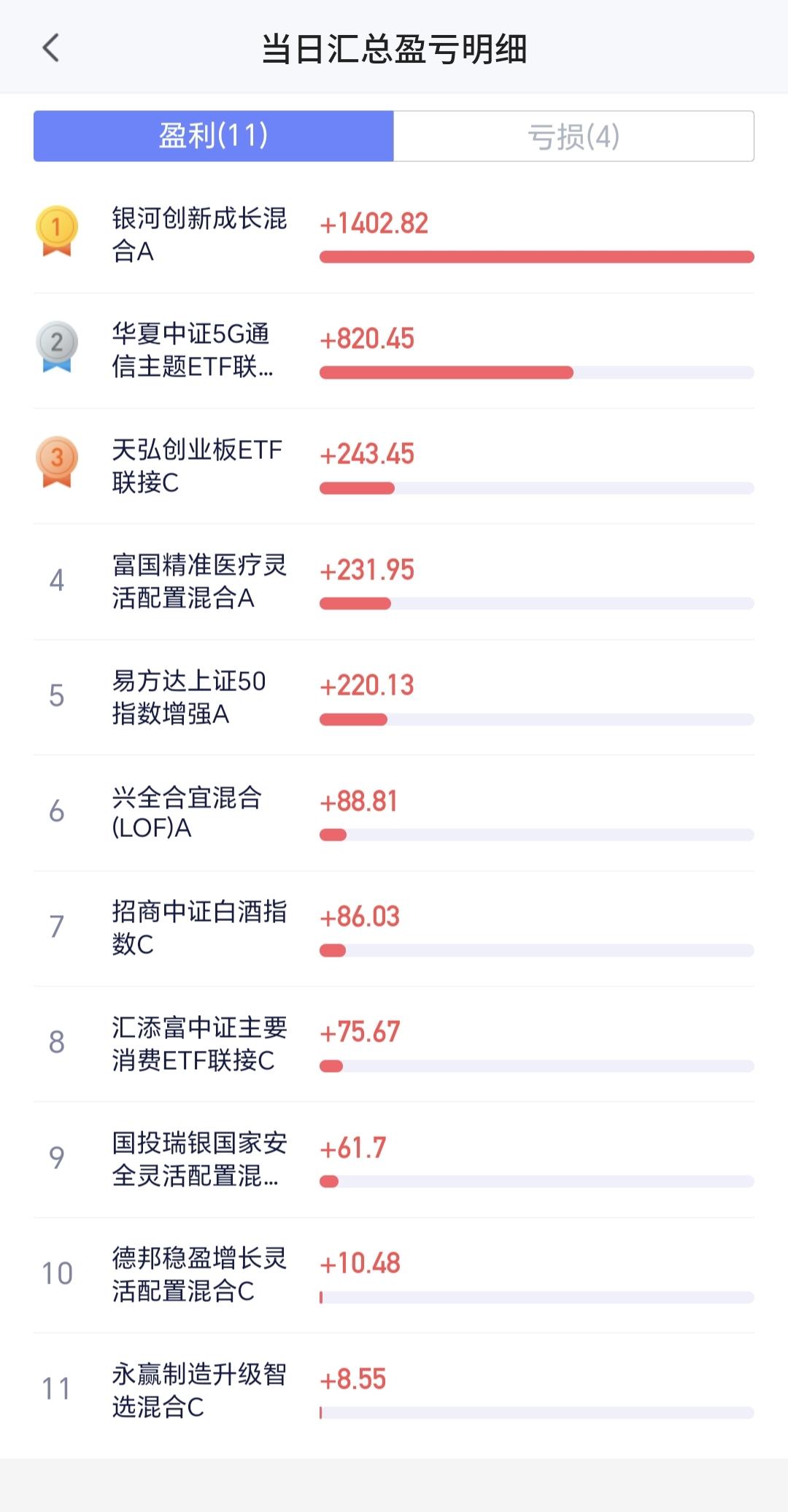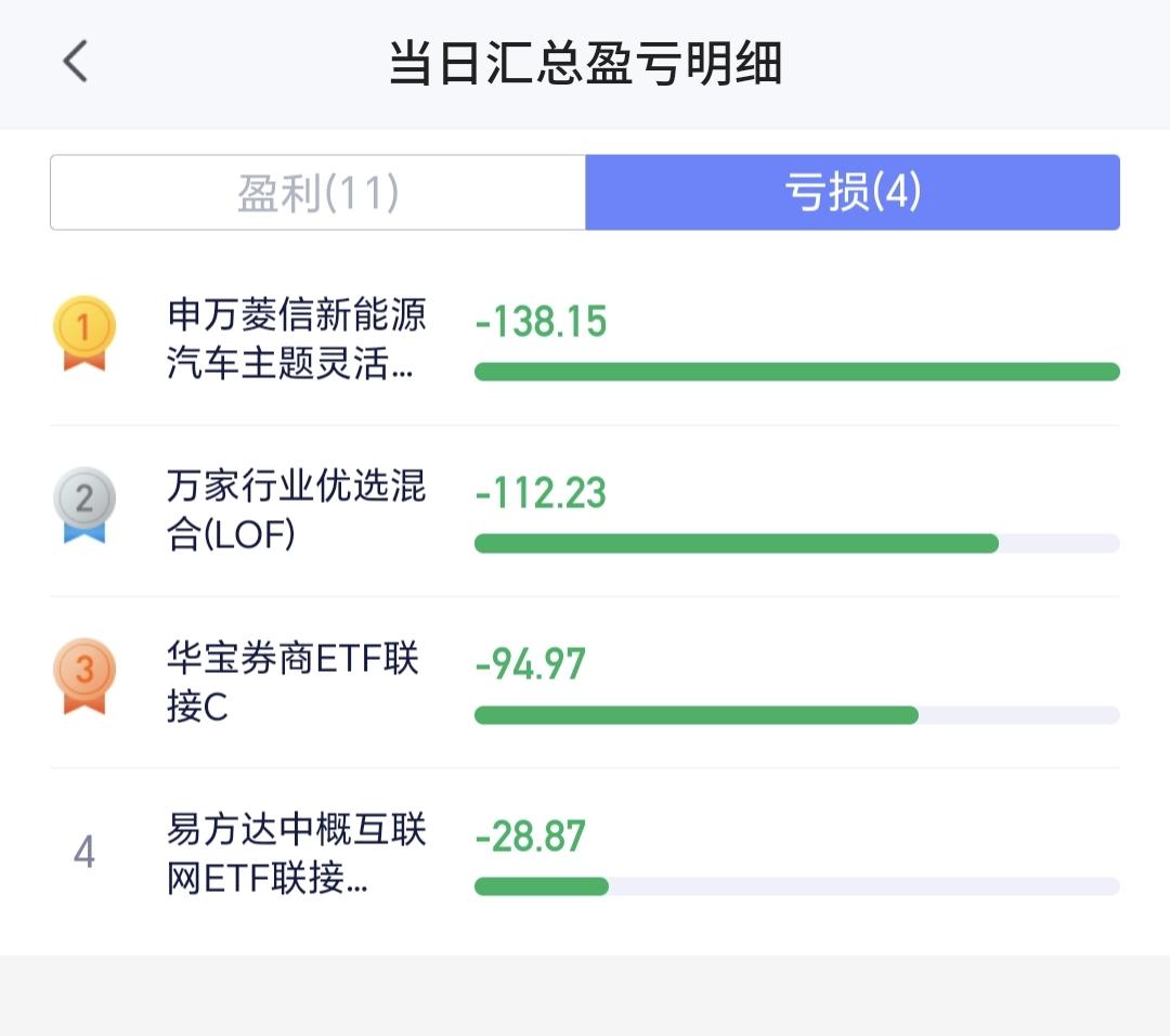 持有的基金中,盘中估值盈利金额最大的三个板块是:芯片半导体板块,5G板块,创业板指,估值亏损金额最大的三个板块是:新能源汽车板块,先进制造板块,证券板块,估值整体上涨了3038元。
