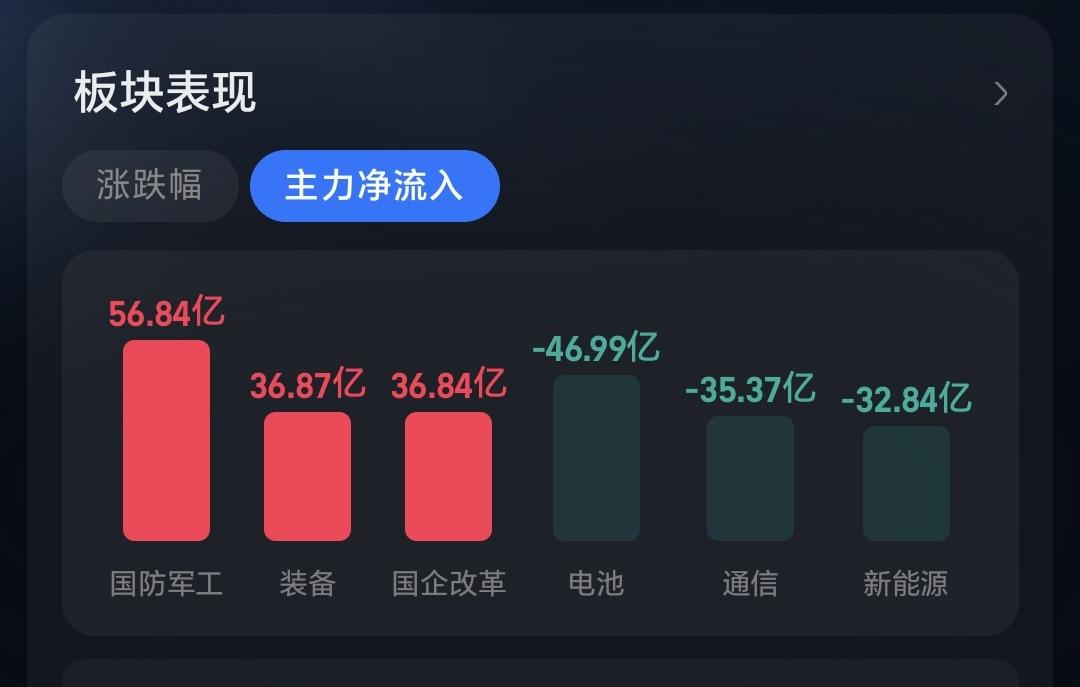 主力资金净流入最多的三个板块是:军工板块,装备板块,国企板块,主力资金净流出最多的三个板块是:电池板块,通信板块,新能源板块。
