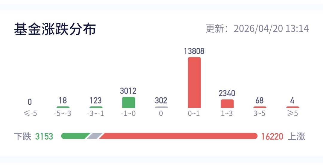整个基金市场,上涨16220家,下跌3153家,上涨幅度超过5%的4家,没有下跌幅度超过5%的基金。
