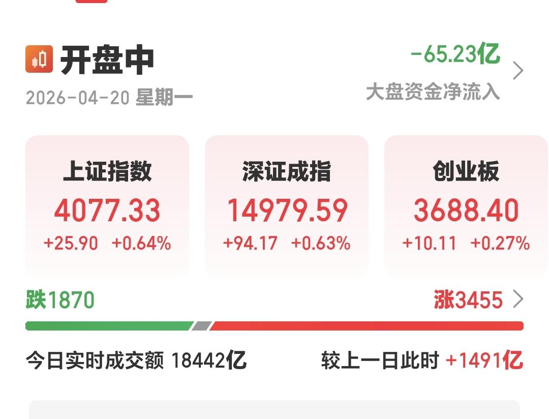 整个股票市场,上涨3455家,下跌1870家,两市累计成交18442亿,相比于上一个交易日同期放量了1491亿,主力资金净流出65亿。