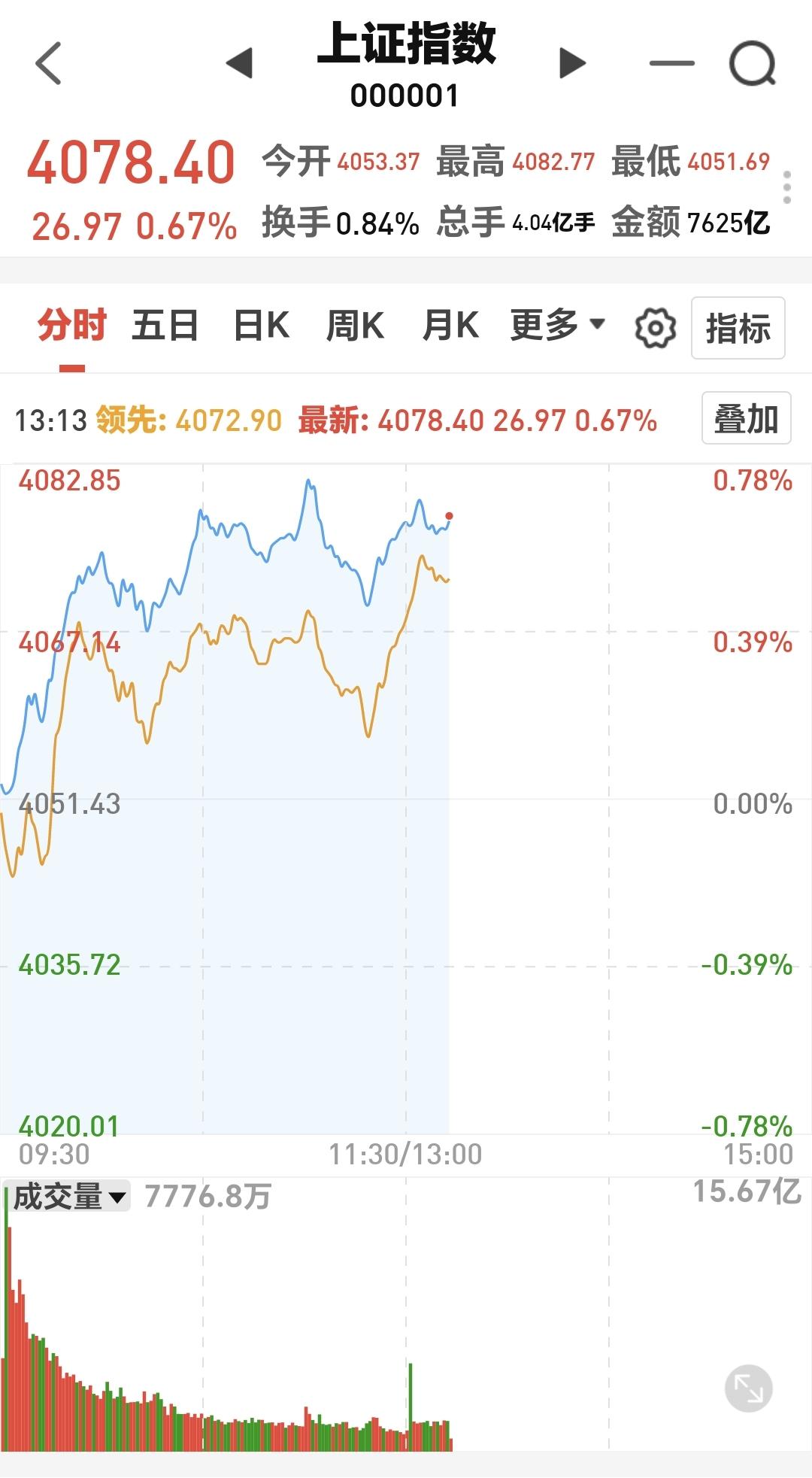 市场下午开盘以后小幅度震荡,创业板指上涨了0.32%,盘中点位3690点,上证指数上涨了0.65%,盘中点位4077点。