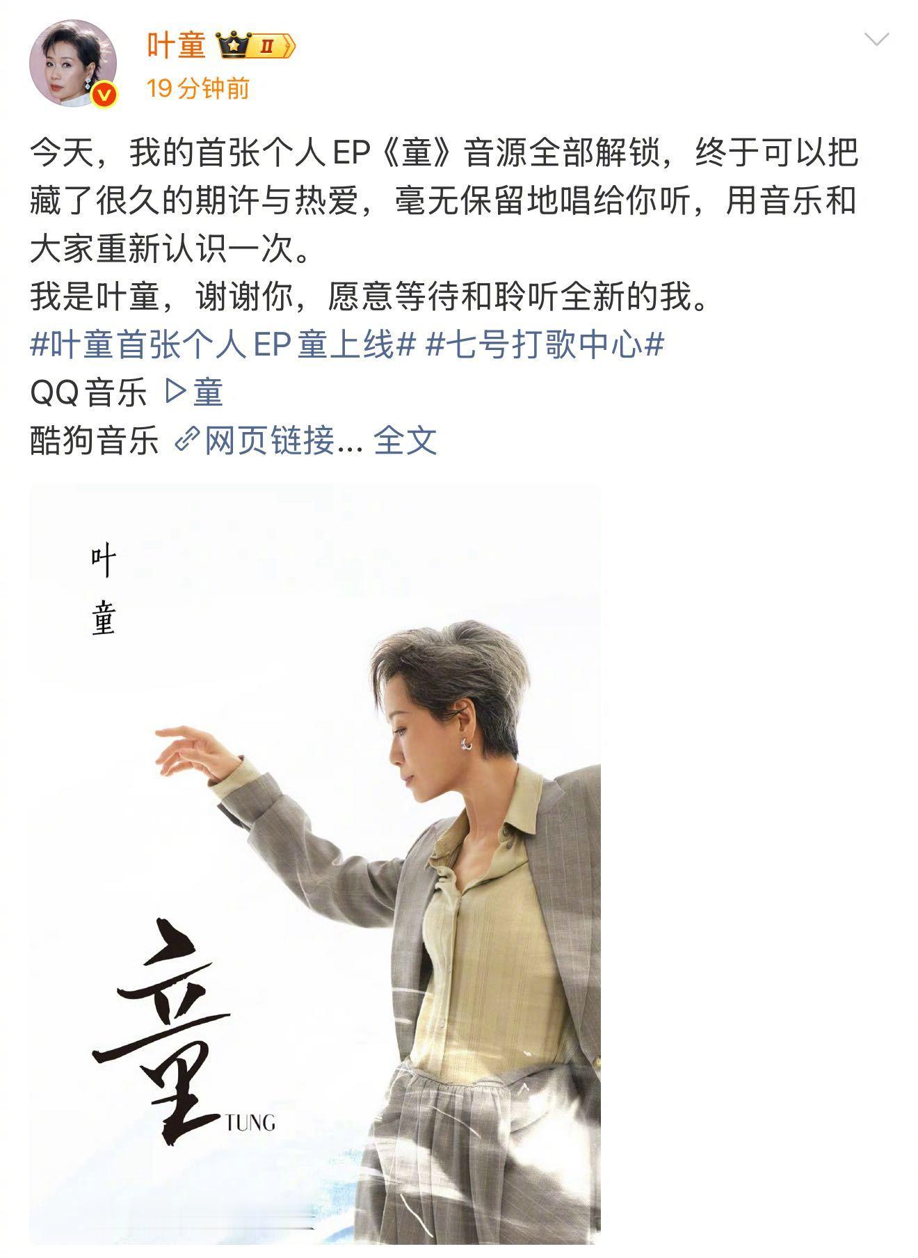 叶童首张个人EP童上线 终于等到完整上线!首张个人EP《童》正式解锁,从自由洒脱的《慢游记》、温柔治愈的《等一个傍晚》,到慵懒浪漫的《夜色恋人》、国风深情的《两地书》,再到态度鲜明的《不一样的我》,整张EP以完整情绪动线勾勒出一个跳出角色标签、真实鲜活的叶童。这不仅是一张音乐EP,更是一场关于自我、自由与勇敢的内心旅程,让每一个听众都能在旋律里,重新认识那个不一样的她。叶童 叶童首张个人EP童
