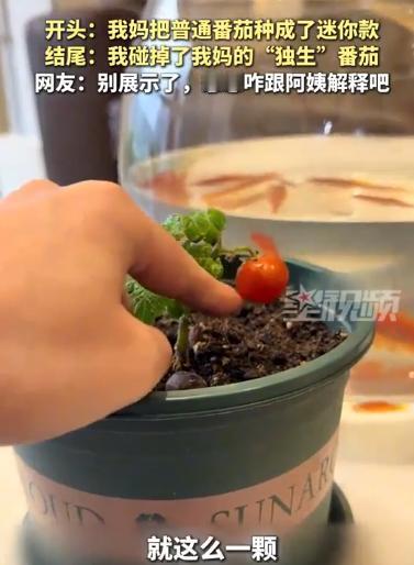浙江,一女子拍视频展示妈妈种的小番茄,一边嘲笑说秧苗长得矮,一边又说它只结了一个