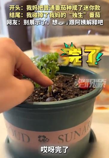 浙江,一女子拍视频展示妈妈种的小番茄,一边嘲笑说秧苗长得矮,一边又说它只结了一个果实,说完还用手指比量了几下,万万没想到手一抖,小番茄竟然意外被碰掉,女子当场泄了气,紧张的说了一句:完了!