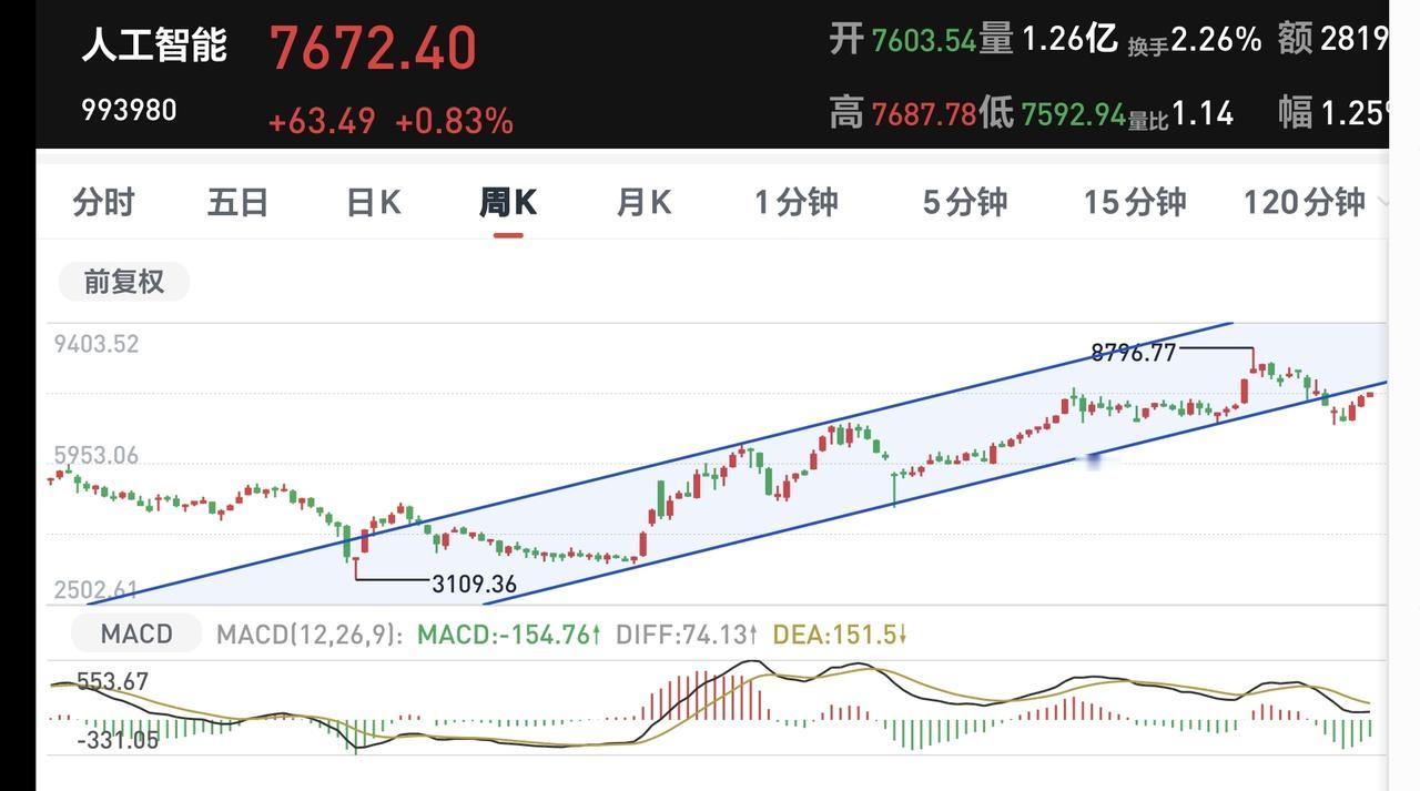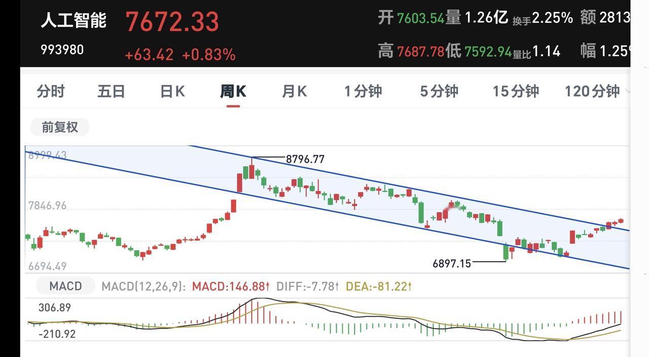 人工智能板块上周上涨突破了日线级别下跌通道的上轨线,现在是处于有效突破当中,今天是继续上涨,短线持有的人可以继续持有。