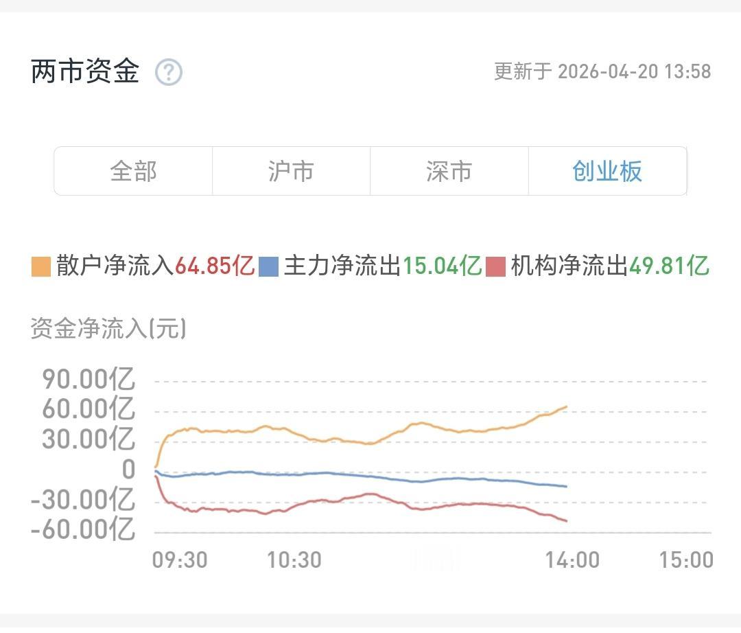 创业板指最近走势很猛,指数是屡创新高,我们来看一下今天创业板指资金的情况,两点钟的时候,散户净流入64亿,主力资金净流出15亿,机构资金净流出49亿,也就是今天散户已经从主力资金和机构资金手中接了64个亿的筹码,这样的情况之下,你觉得应该怎么办?