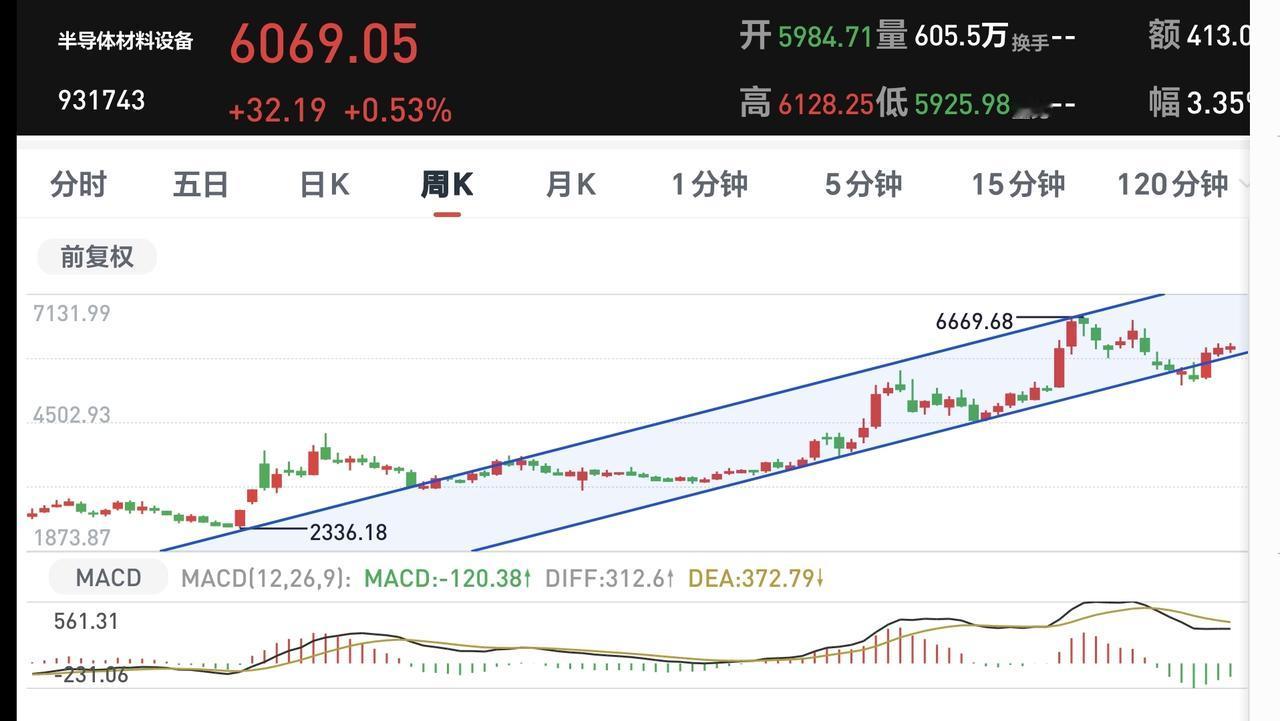 半导体材料设备板块周线级别处于上涨通道中,只要能够保持在这个上涨通道中运行,这个板块周线级别就处于上涨趋势中,长线持有的人就可以继续持有。