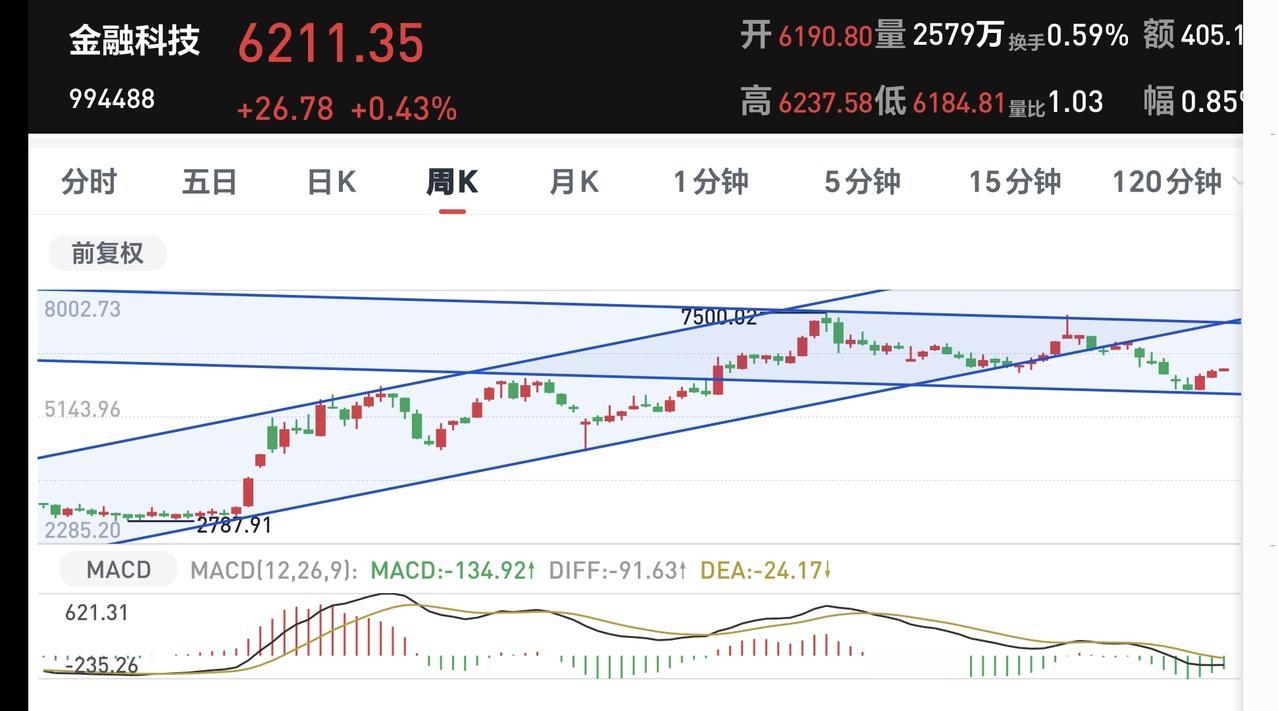 金融科技板块周线级别处于短期下跌通道中,最近的上涨并没有能够突破这个下跌通道的上轨线。这个板块周线级别还短期处于下跌趋势中,长线持有的人继续注意风险。