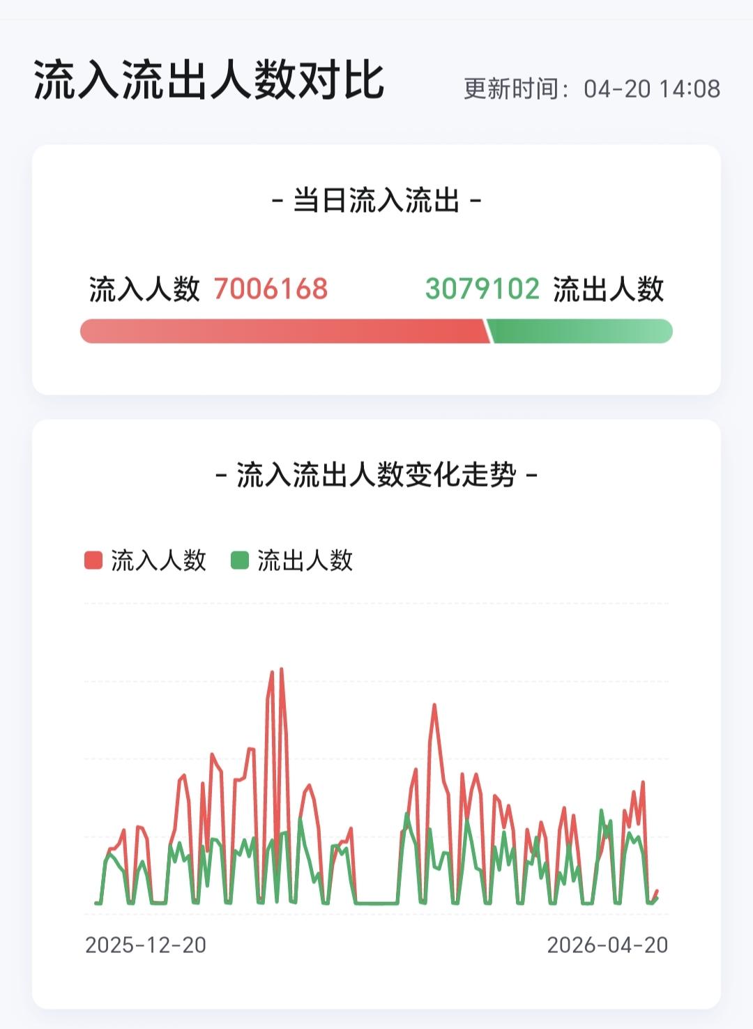 看下面的截图,这是今天加仓人数和减仓人数,今天加仓人数为7006168人,今天减仓人数为3079102人,加仓人数超过了减仓人数。