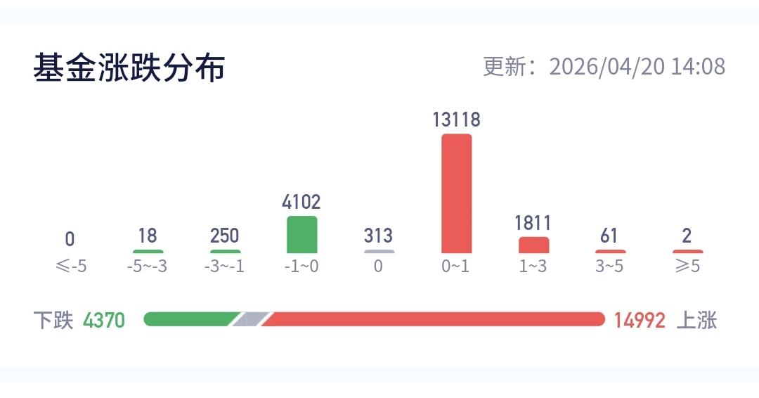 整个基金市场,上涨14992家,下跌4370家,上涨幅度超过5%的2家,没有下跌幅度超过5%的基金。
