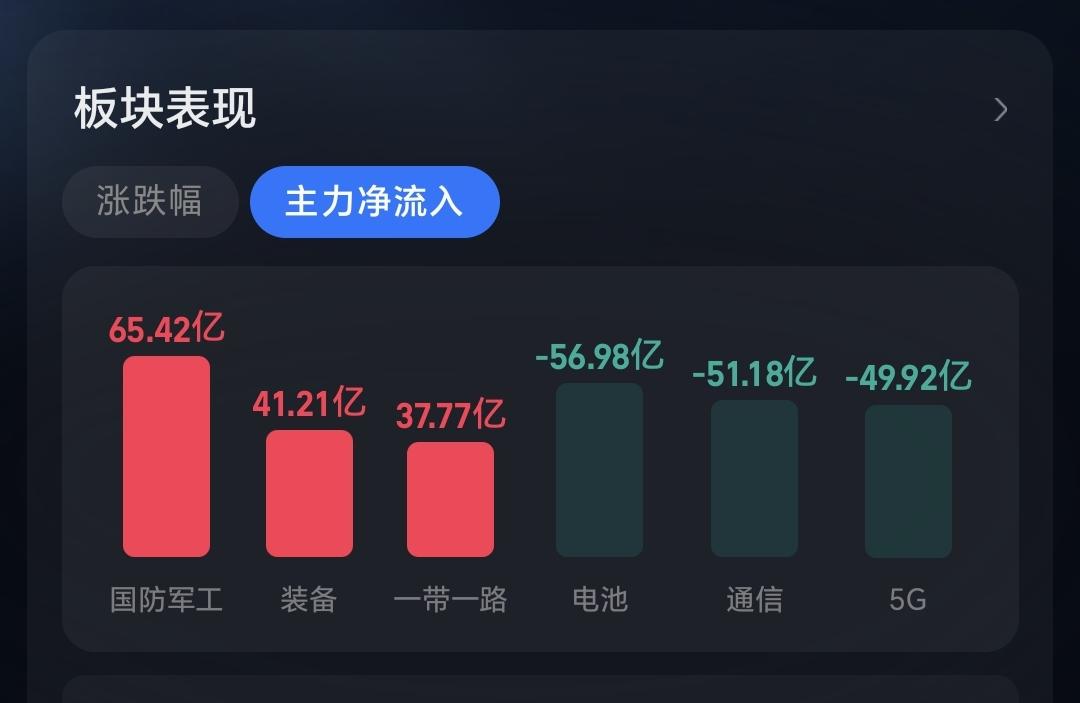 主力资金净流入最多的三个板块是:军工板块,装备板块,一带一路板块,主力资金净流出最多的三个板块是:电池板块,通信板块,5G板块。