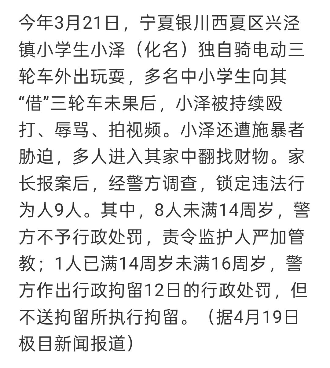 可最让人愤怒的还是处罚结果。警方调查后锁定9名施暴者,他们全是中小学生。8个因为案发时未满14岁,依据法律不处罚,只是让家长带回去“严加管教”。