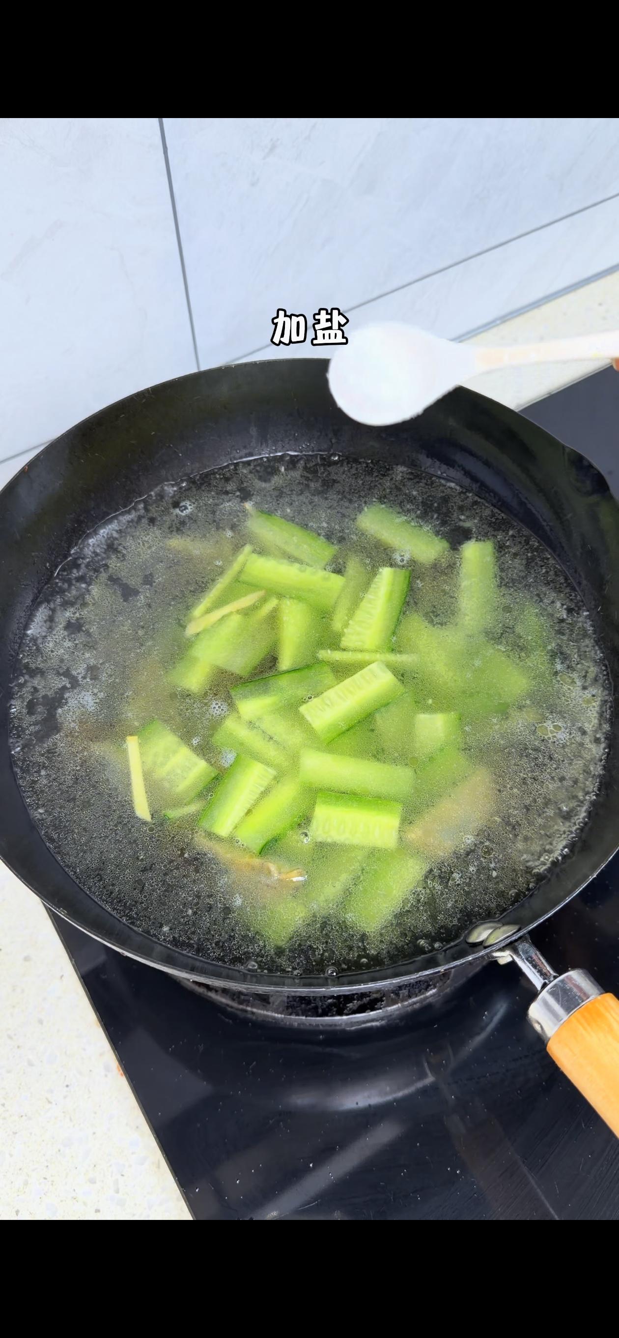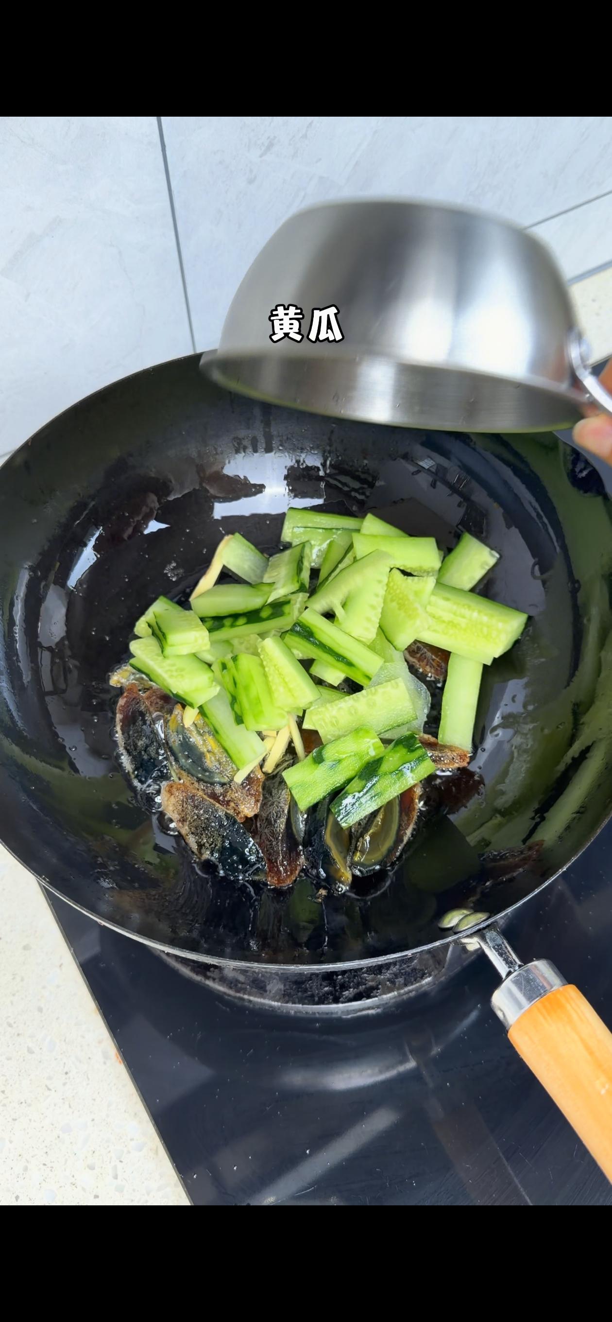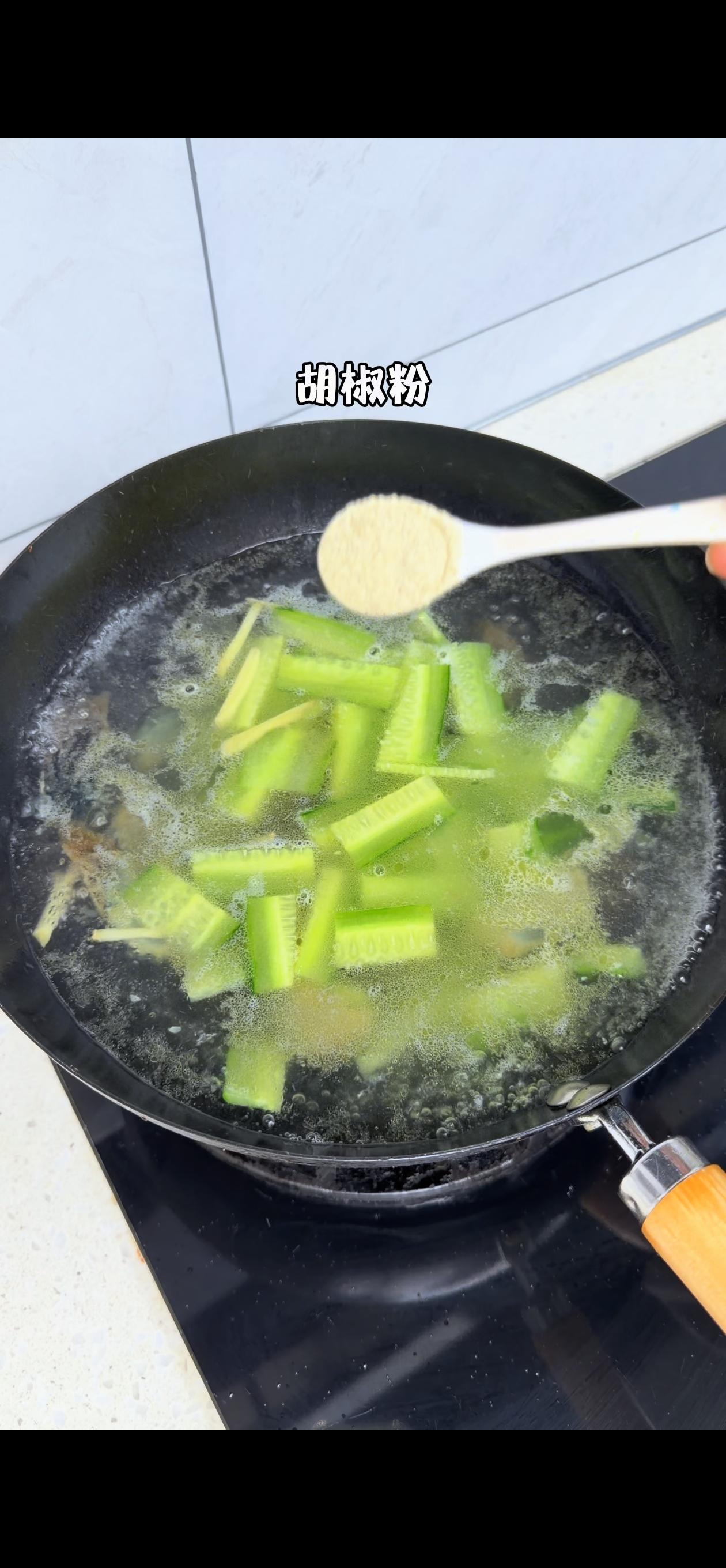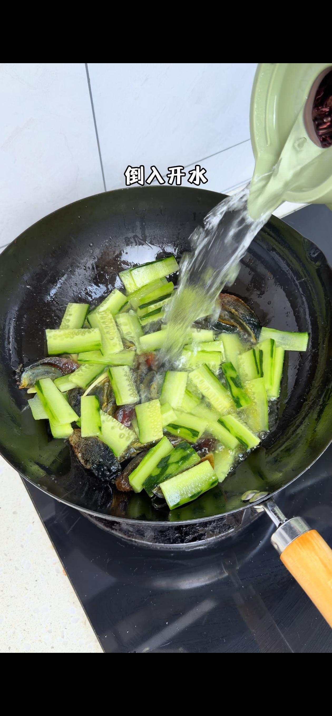 3️⃣混合炖煮:加入姜丝和黄瓜翻炒几下,倒入适量开水(一定要开水!汤才会更白更浓),大火煮3分钟后转小火,加盐和胡椒粉调味,再煮2分钟,最后撒上芹菜叶就完成啦~
