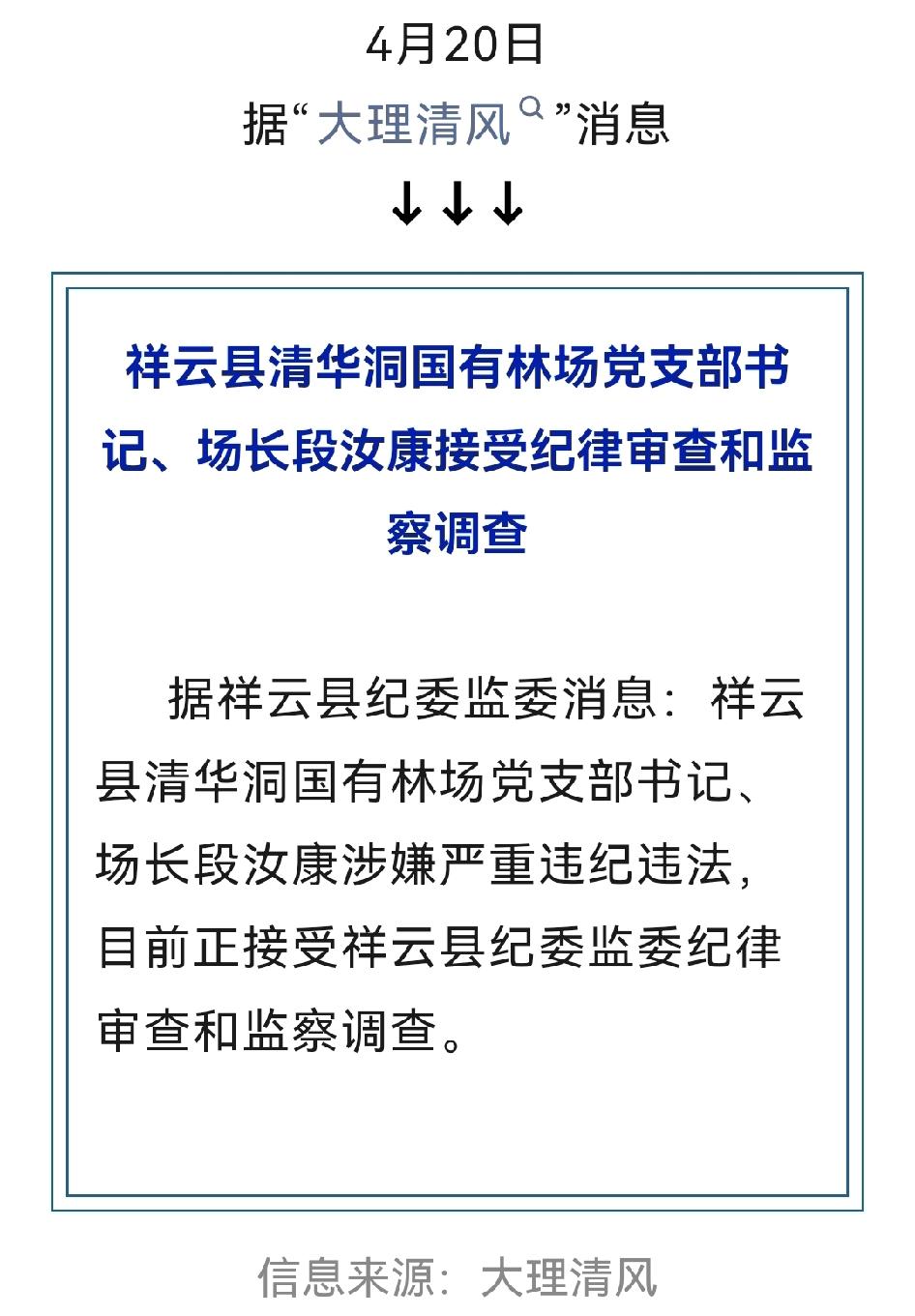 刚看到通报,大理祥云县清华洞国有林场党支部书记、场长段汝康被查了。 4月20日