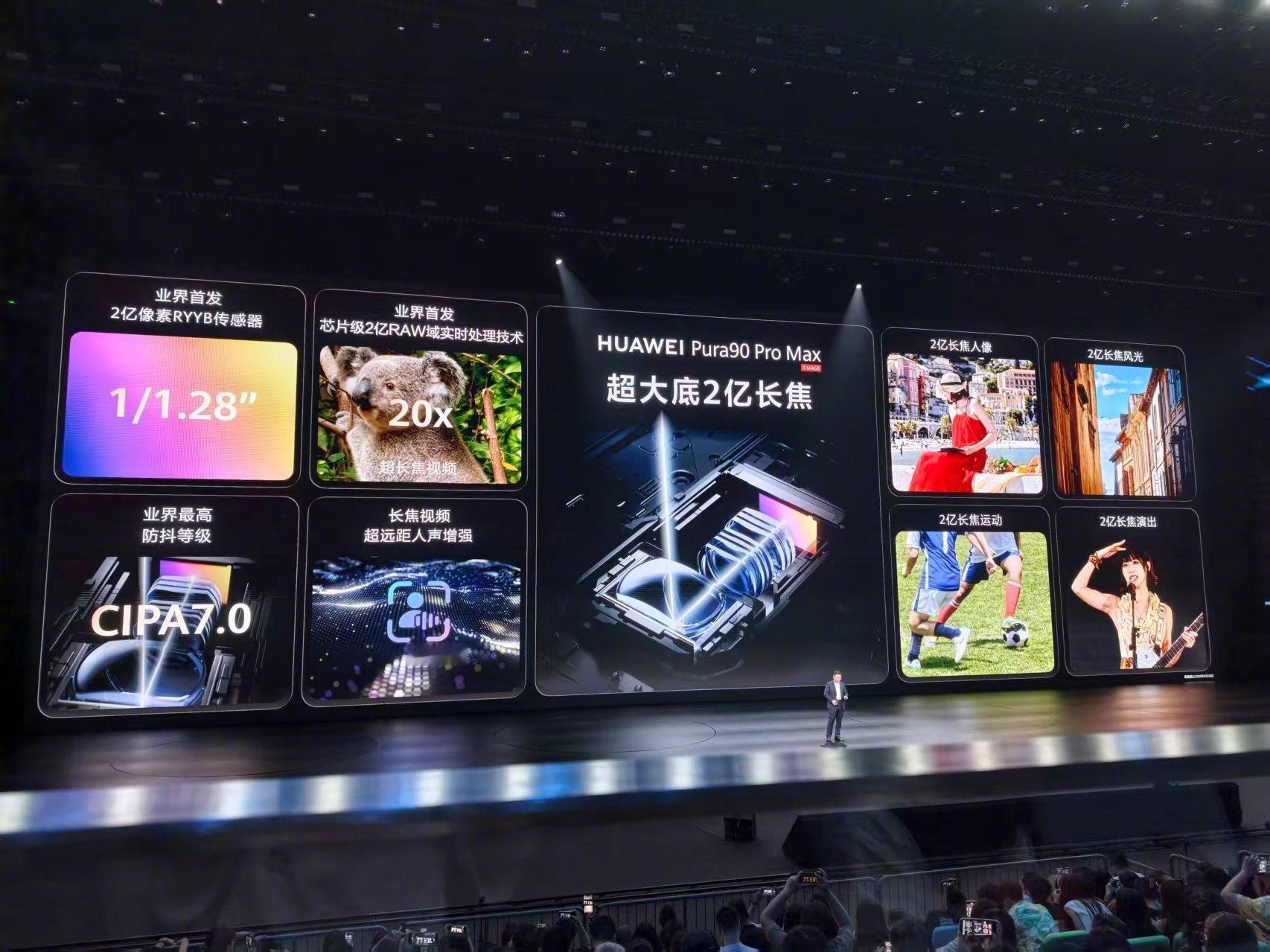 Pura90 Pro Max则配备4000万像素超广角摄像头,F2.2光圈,RYYB;主摄为5000万像素超高动态主摄,采用1/1.28英寸大底LOFIC,支持F1.4-F4.0十档物理可变光圈、OIS,采用RYYB;长焦部分为超大底2亿像素长焦,传感器尺寸为1/1.28英寸,采用RYYB,支持4倍光学变焦、F2.6光圈、OIS,并支持长焦微距,同样配备第二代红枫原色摄像头。官方还提到,这颗长焦的防抖能力达到CIPA7.0,同时带来芯片级2亿RAW域实时处理技术,20x超长焦视频清晰度提升124%,并支持3.3x增距镜。