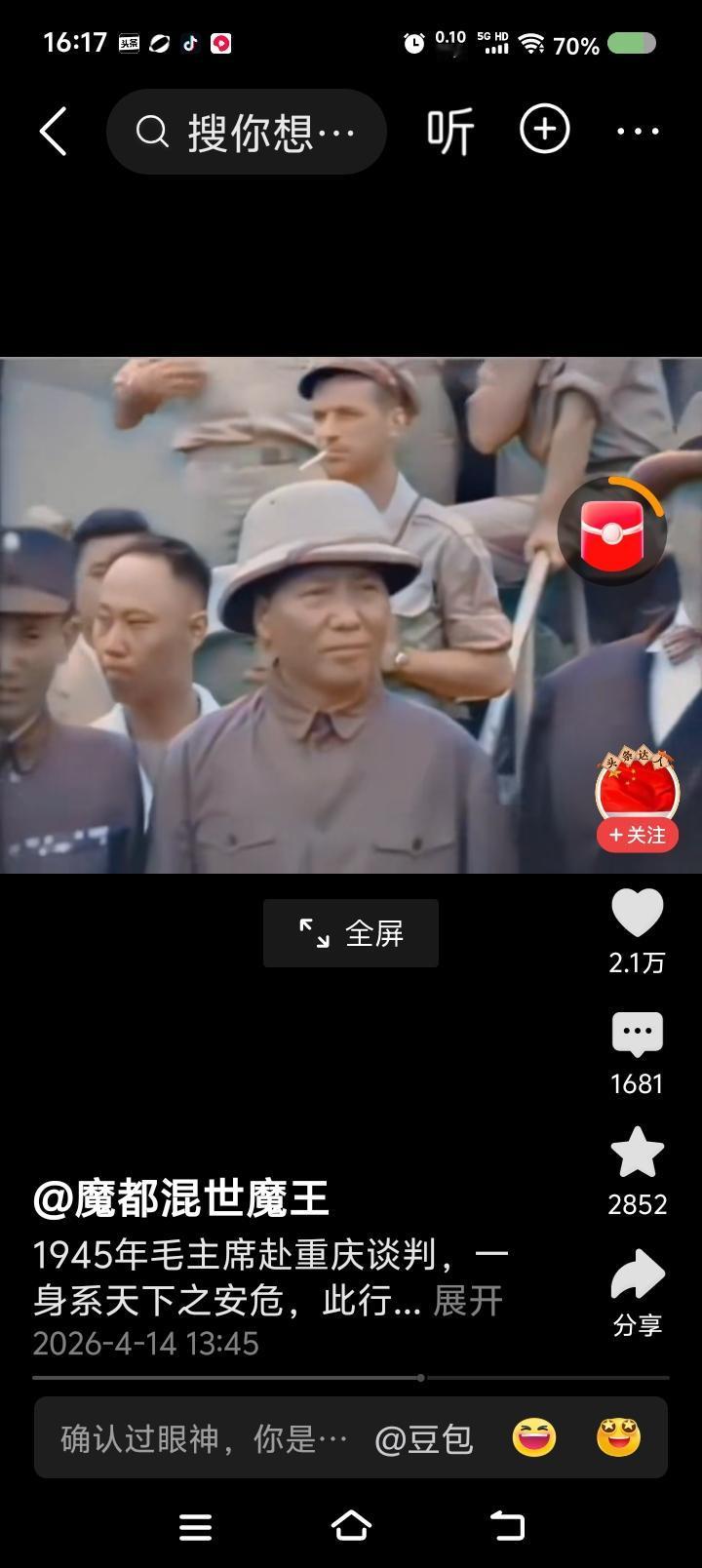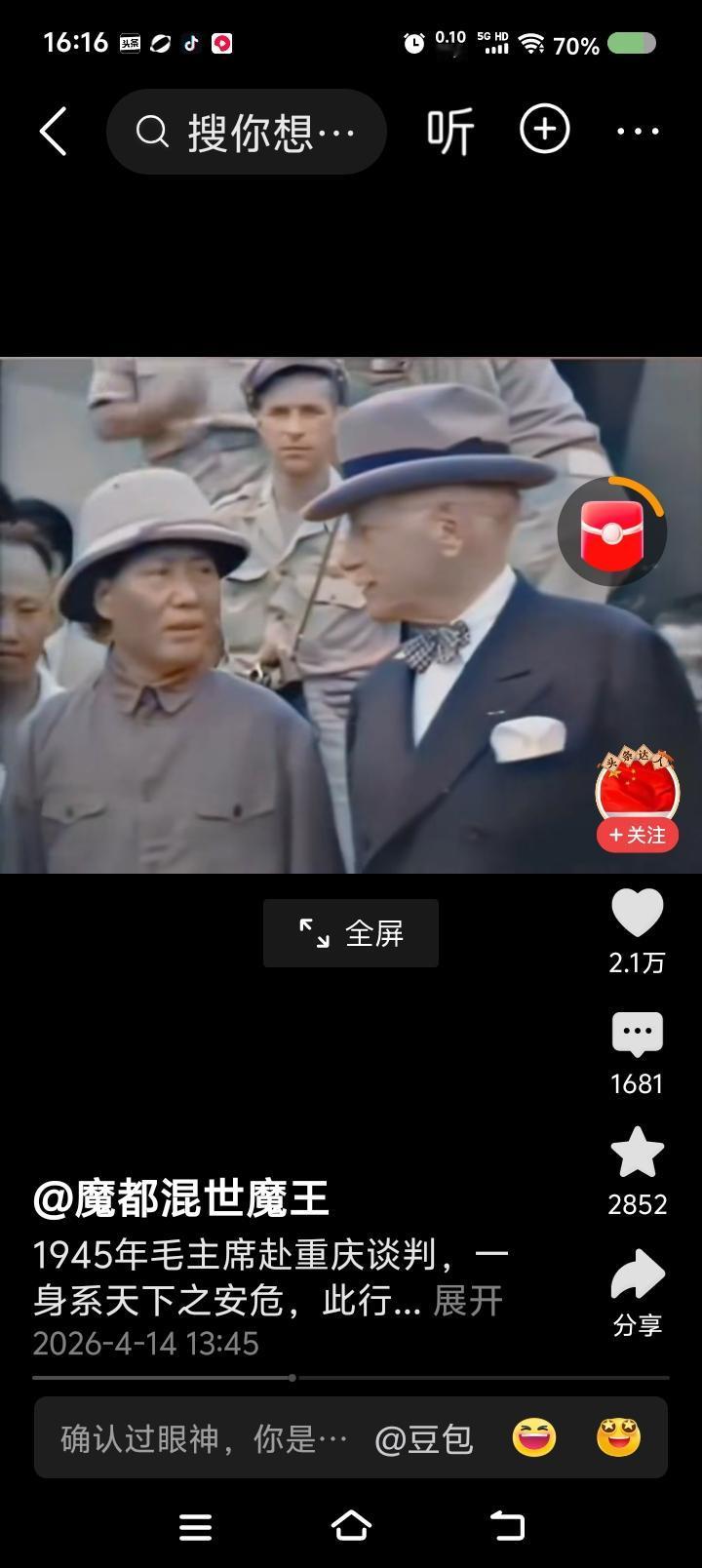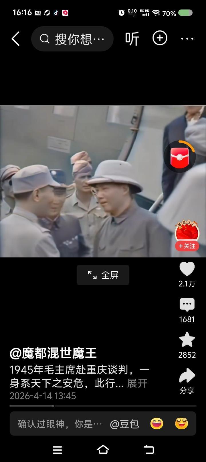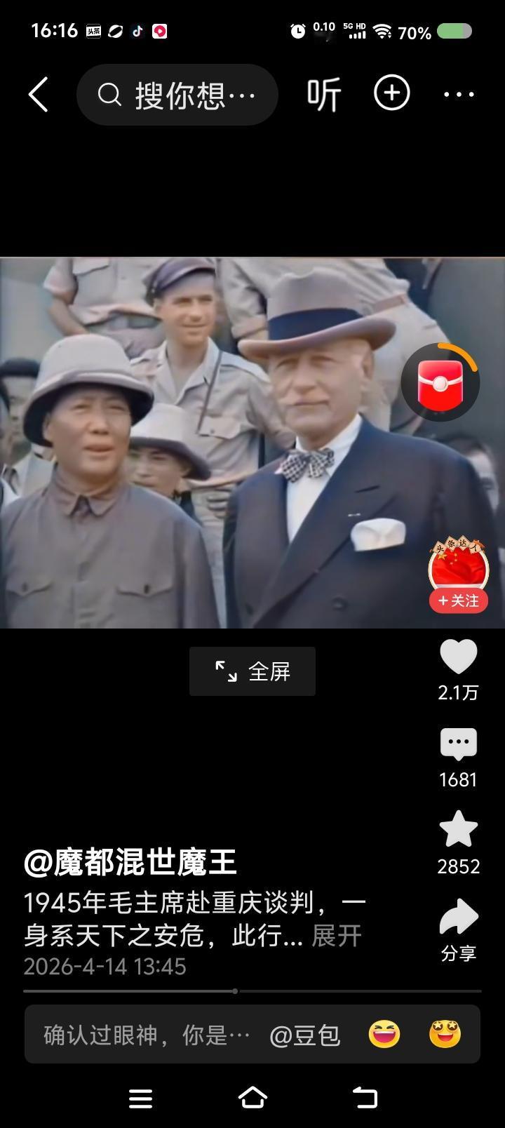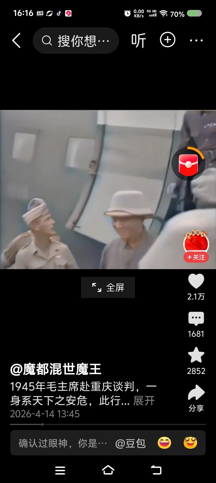 网上播放的新闻视频:毛泽东赴重庆谈判,下飞机前后的场面。