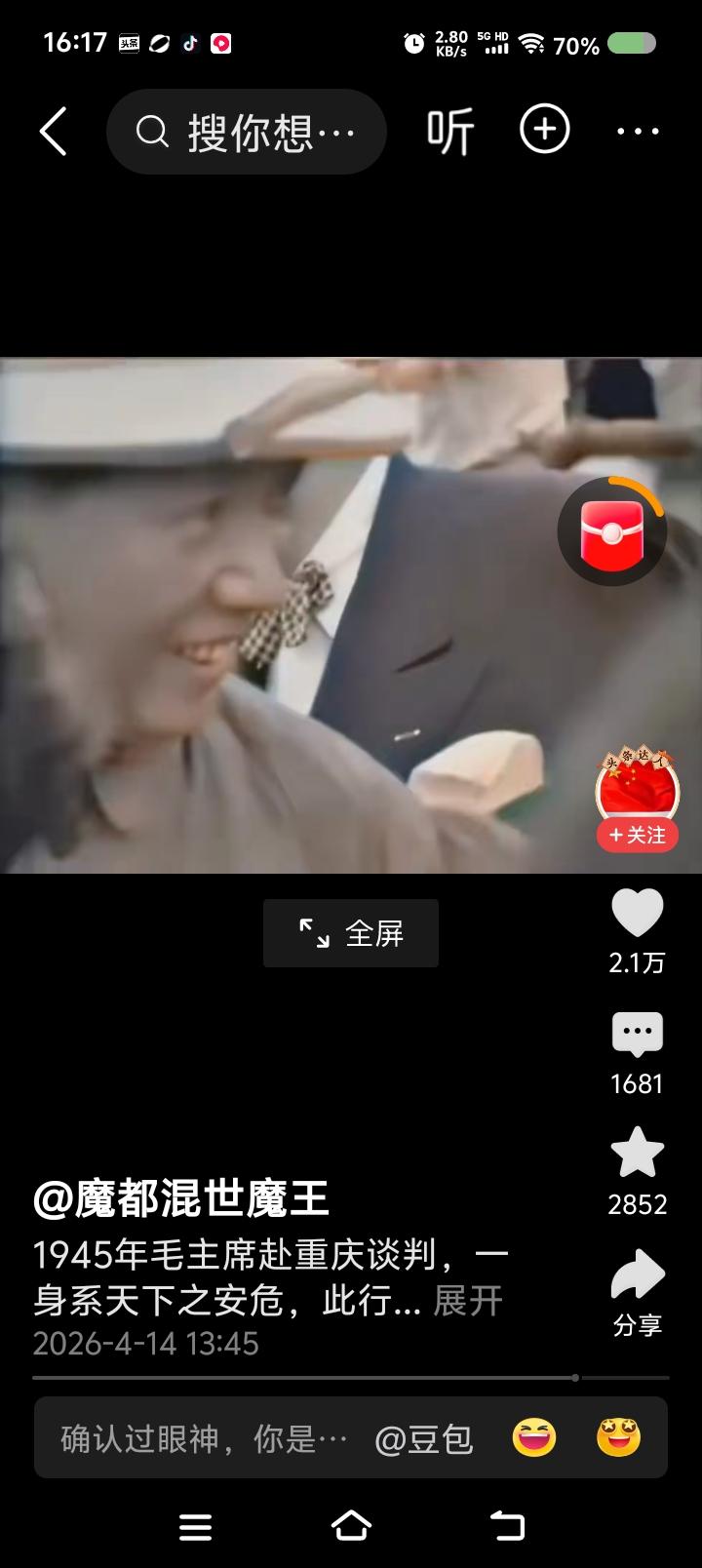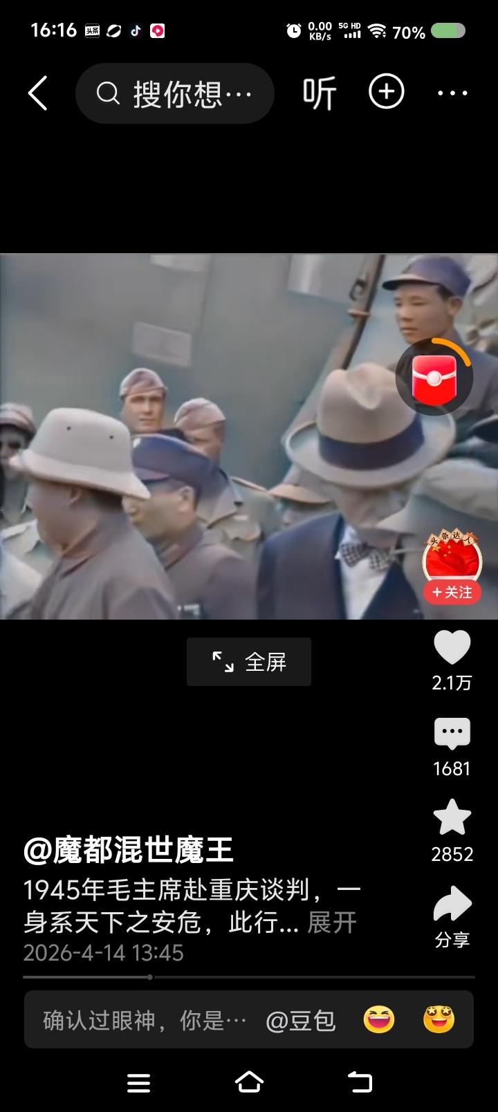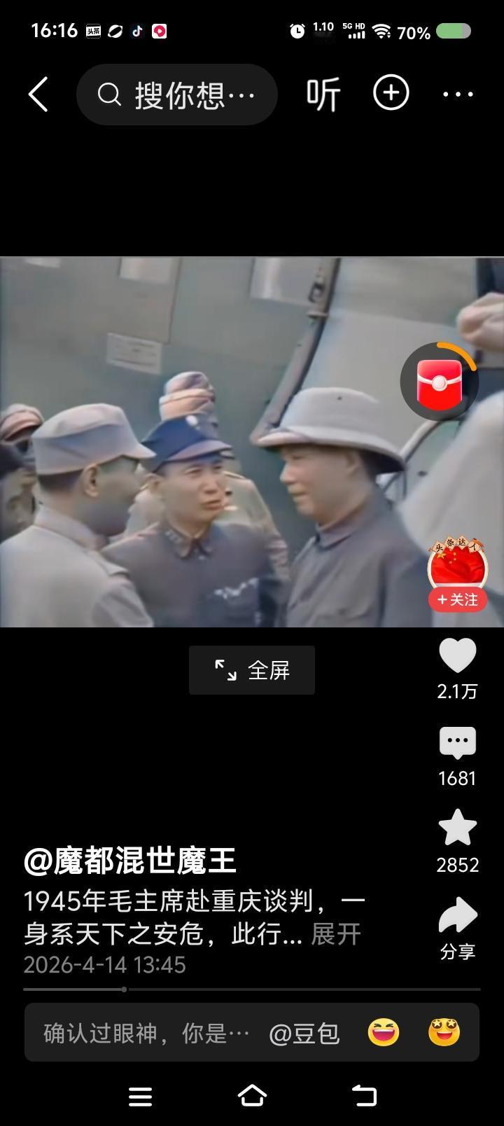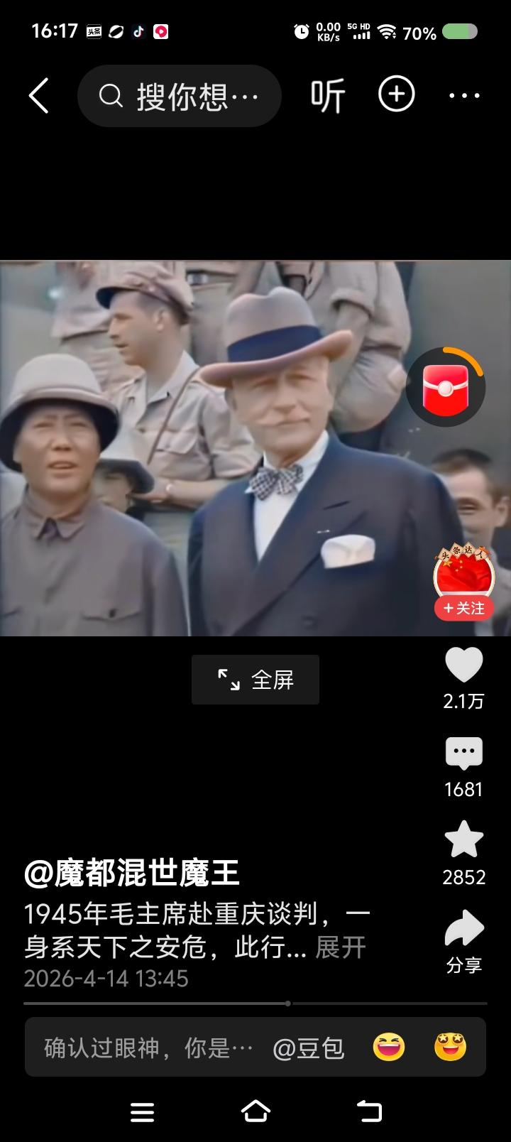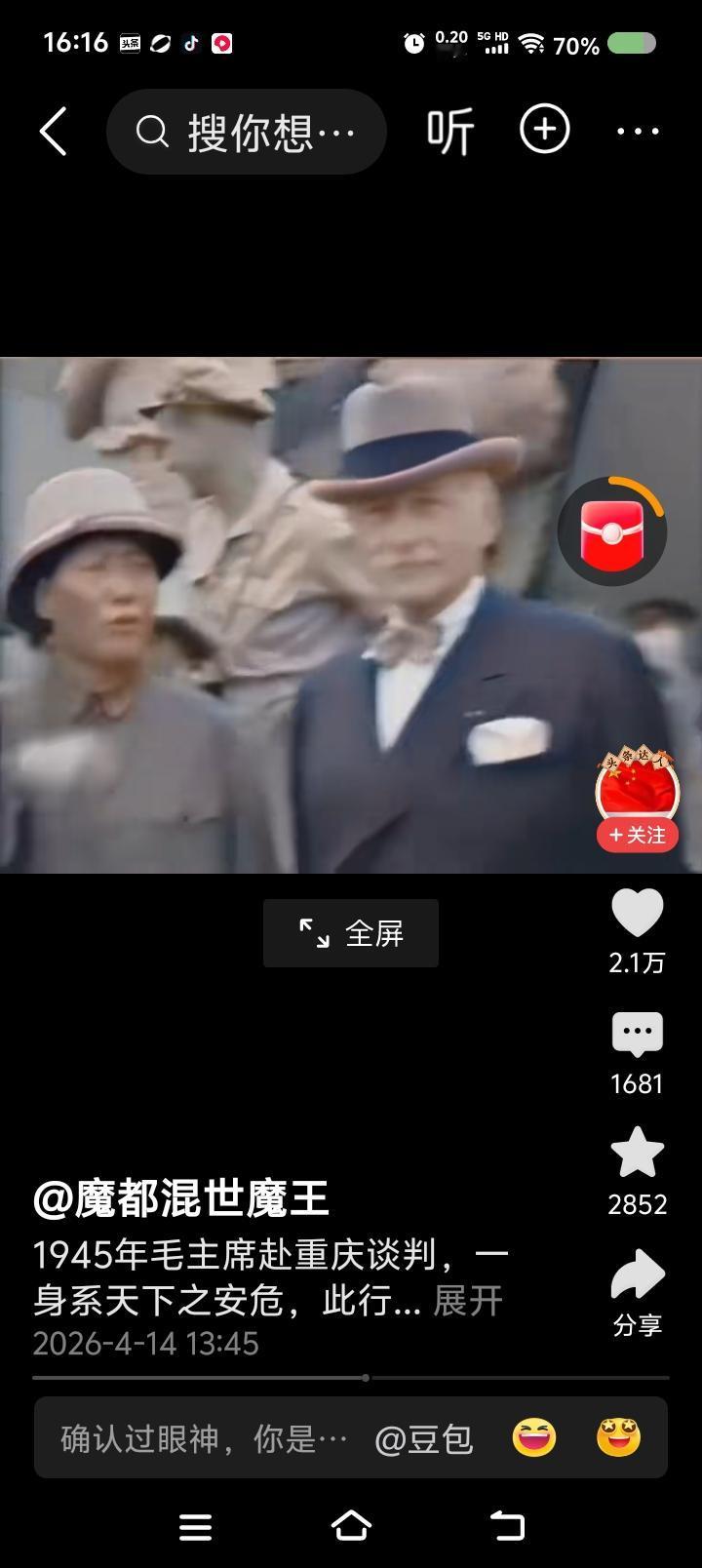 网上播放的新闻视频:毛泽东赴重庆谈判,下飞机前后的场面。