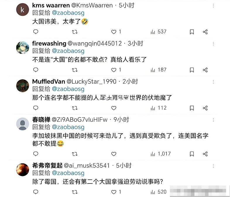 美国指责新加坡存在强迫劳动和产能过剩的问题,《联合早报》作为新加坡媒体,一贯对华说话比较大声,但是对美国连个名字都不敢说,直接说某大国指责新加坡。坡县作为美国小弟几十年,确实不敢当面说的太大声,要不然又要被针对了。