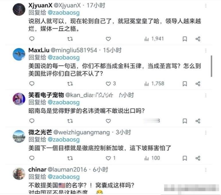 新加坡所以面对美国的指责,也只是敢说有某大国的指责,而不是点名道姓,因为联合早报报在报道咱们这边的消息,那是相当犀利。但是一旦关于美国的消息,连名字都不敢提,就这么个情况。