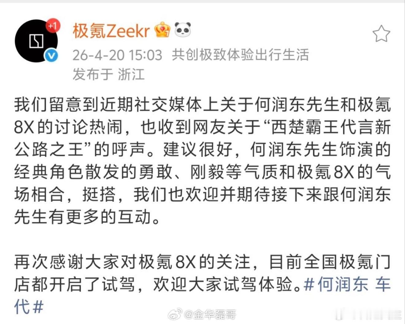 极氪回应网友建议何润东代言硬汉形象与性能座驾气质高度契合,网友的跨界联动脑洞堪称神来之笔。官方高情商回应接住热度,既显诚意又留足想象空间,期待强强联手。极氪回应何润东车代
