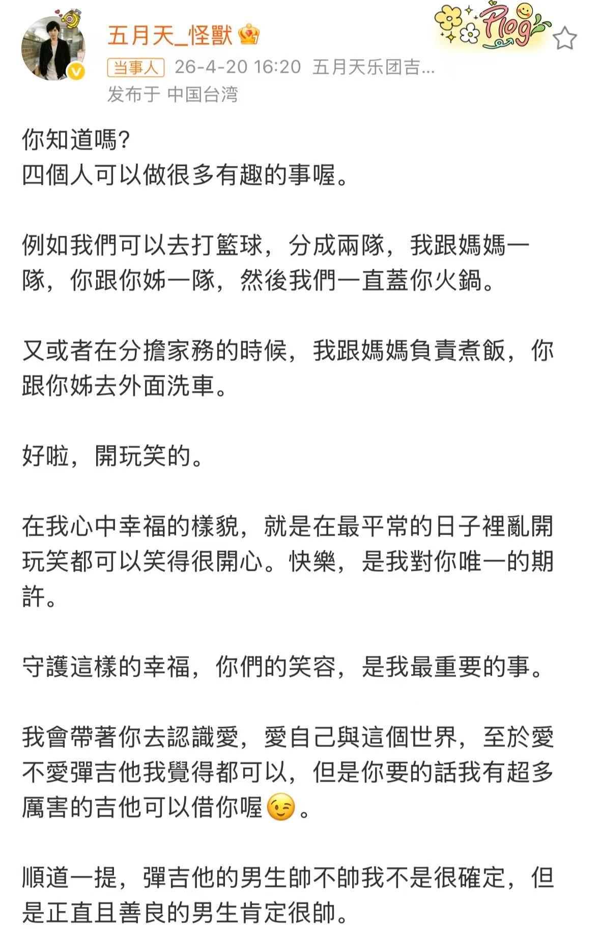 五月天怪兽官宣二胎 五月天怪兽发文官宣二胎,还透露是个儿子,这下要儿女双全了,恭